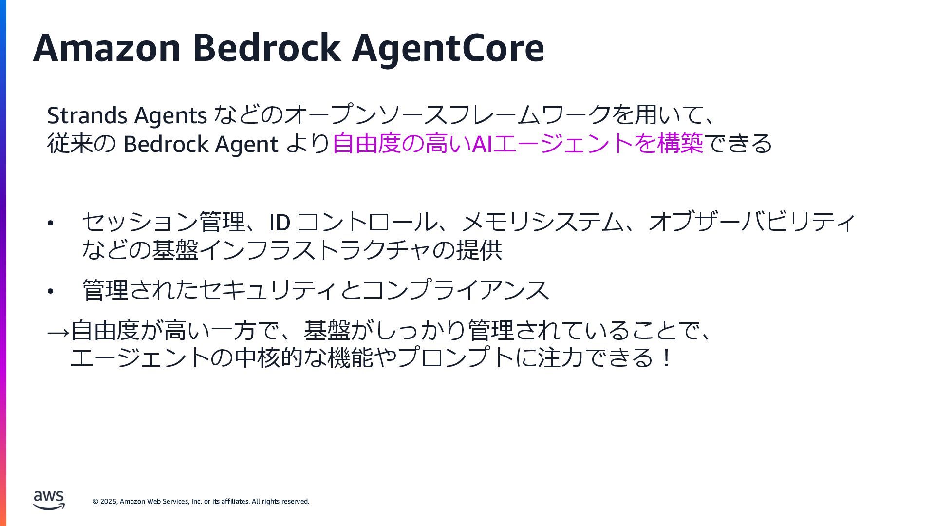 rights reserved. Strands Agents などのオープンソースフレームワークを⽤いて、 従来の Bedrock Agent より⾃由度の⾼いAIエージェントを構築できる • セッション管理、ID コントロール、メモリシステム、オブザーバビリティ などの基盤インフラストラクチャの提供 • 管理されたセキュリティとコンプライアンス →⾃由度が⾼い⼀⽅で、基盤がしっかり管理されていることで、 エージェントの中核的な機能やプロンプトに注⼒できる︕ Amazon Bedrock AgentCore