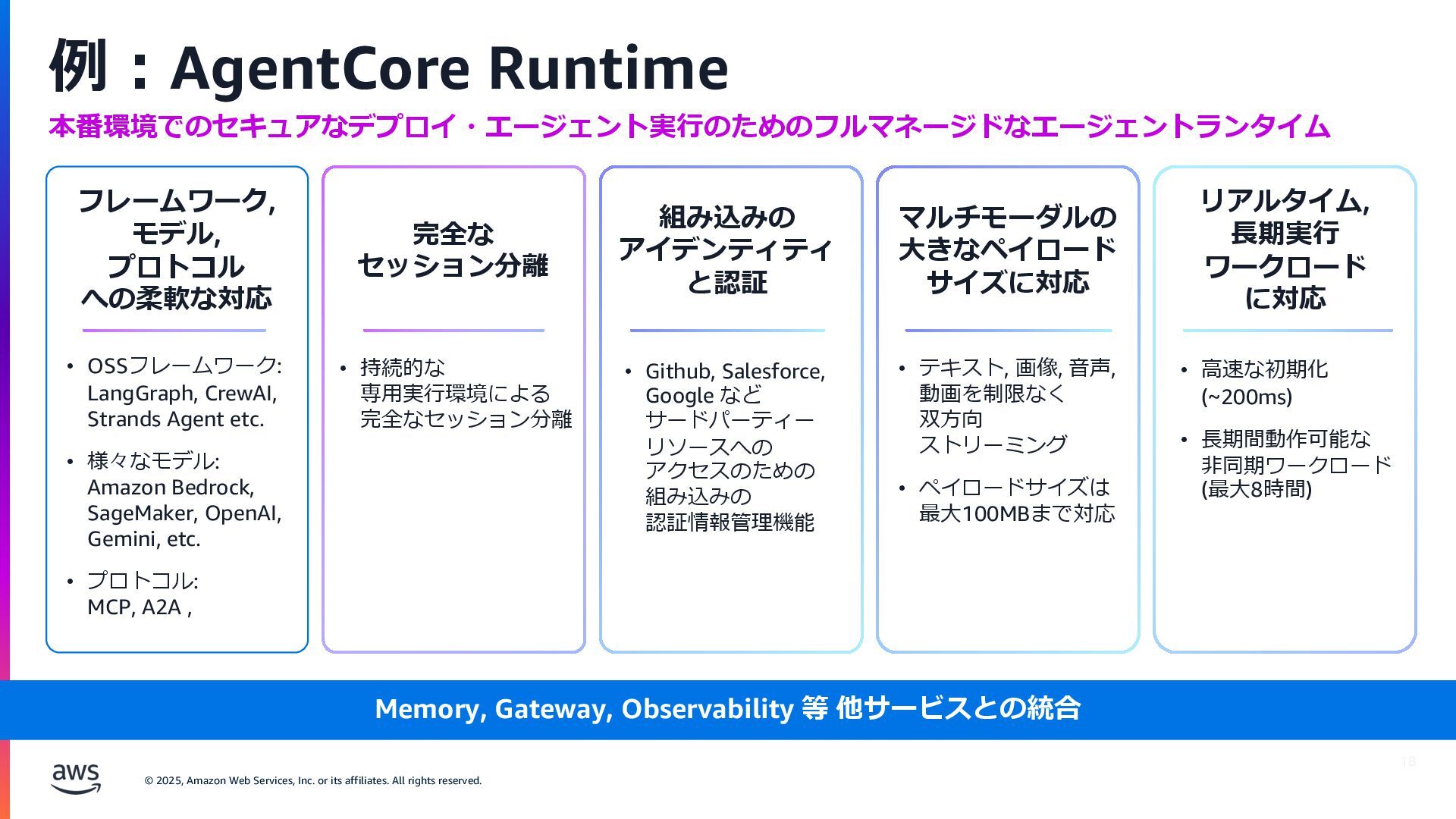 rights reserved. 本番環境でのセキュアなデプロイ・エージェント実⾏のためのフルマネージドなエージェントランタイム 18 例︓AgentCore Runtime • OSSフレームワーク: LangGraph, CrewAI, Strands Agent etc. • 様々なモデル: Amazon Bedrock, SageMaker, OpenAI, Gemini, etc. • プロトコル: MCP, A2A , • Github, Salesforce, Google など サードパーティー リソースへの アクセスのための 組み込みの 認証情報管理機能 フレームワーク, モデル, プロトコル への柔軟な対応 組み込みの アイデンティティ と認証 Memory, Gateway, Observability 等 他サービスとの統合 完全な セッション分離 マルチモーダルの ⼤きなペイロード サイズに対応 • テキスト, 画像, ⾳声, 動画を制限なく 双⽅向 ストリーミング • ペイロードサイズは 最⼤100MBまで対応 リアルタイム, ⻑期実⾏ ワークロード に対応 • ⾼速な初期化 (~200ms) • ⻑期間動作可能な ⾮同期ワークロード (最⼤8時間) • 持続的な 専⽤実⾏環境による 完全なセッション分離