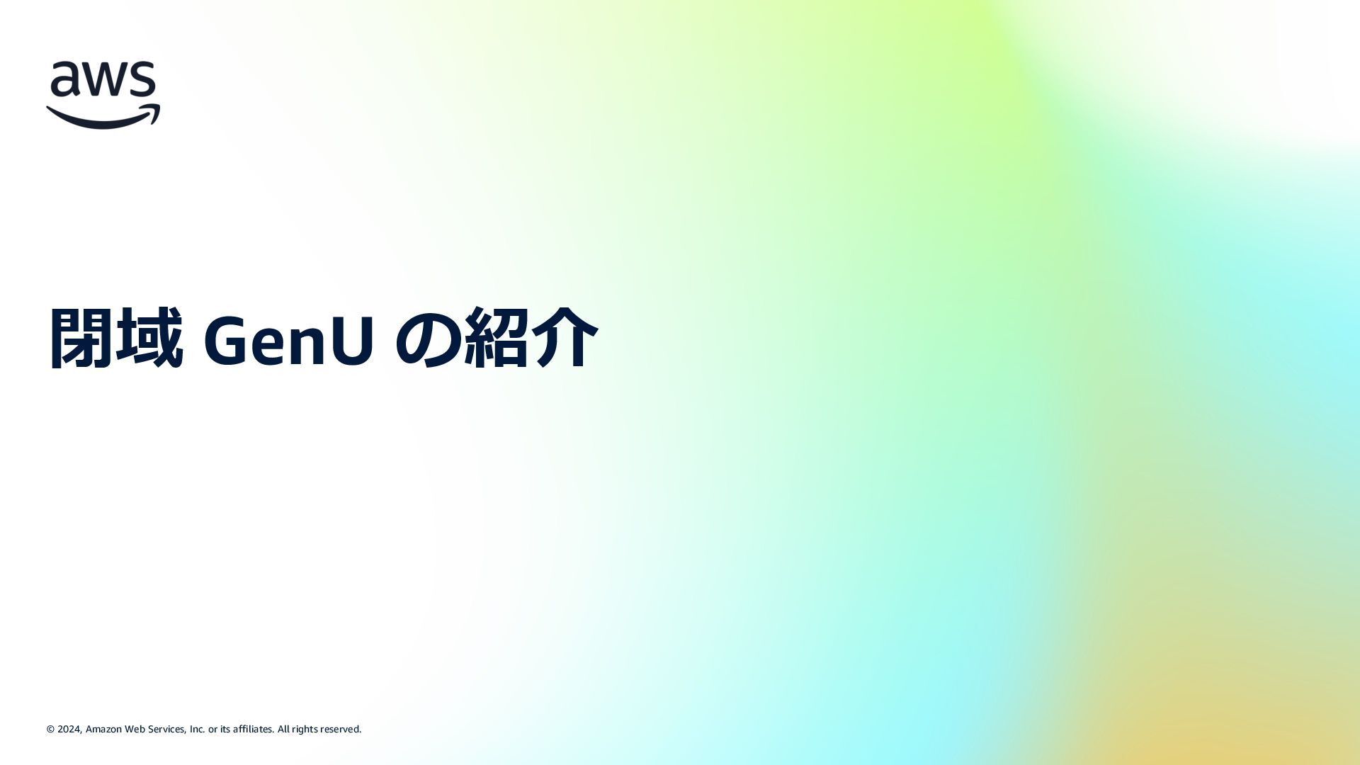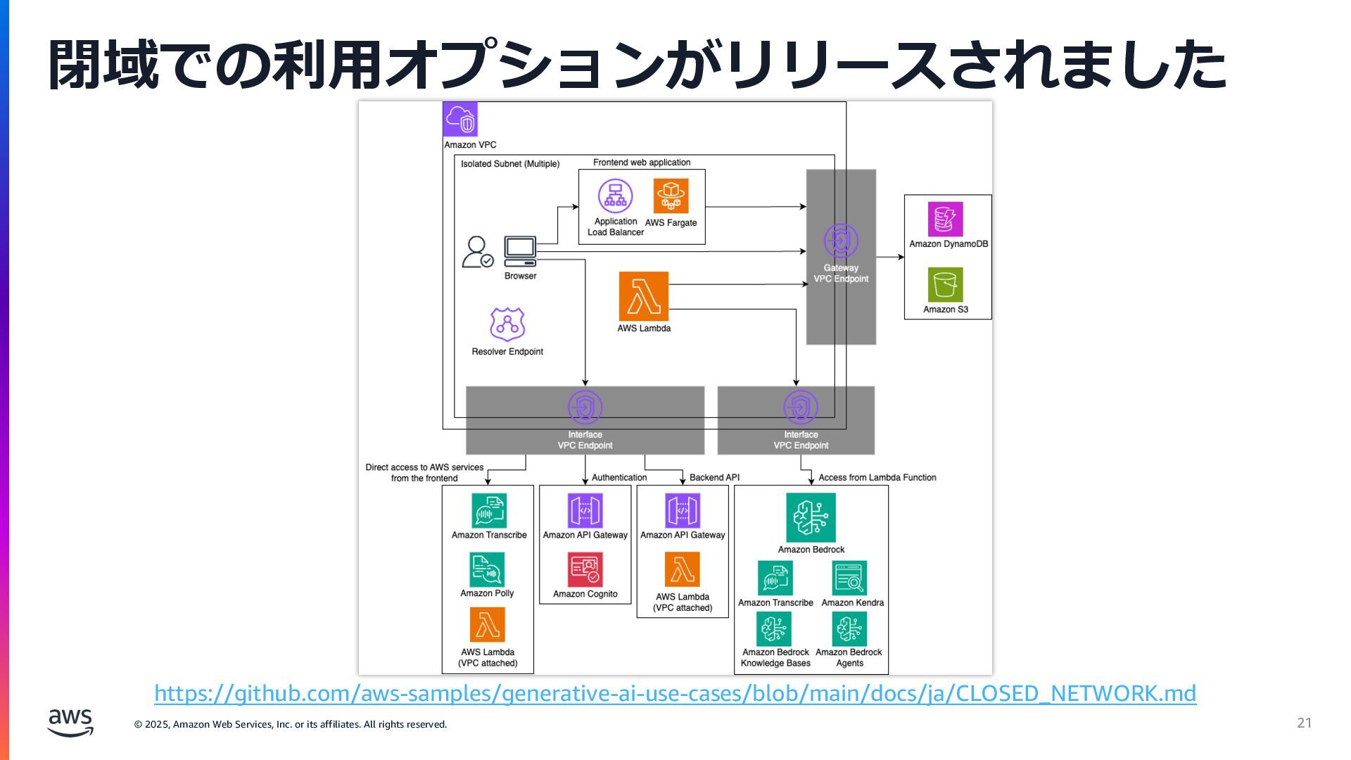 rights reserved. 21 閉域での利⽤オプションがリリースされました https://github.com/aws-samples/generative-ai-use-cases/blob/main/docs/ja/CLOSED_NETWORK.md