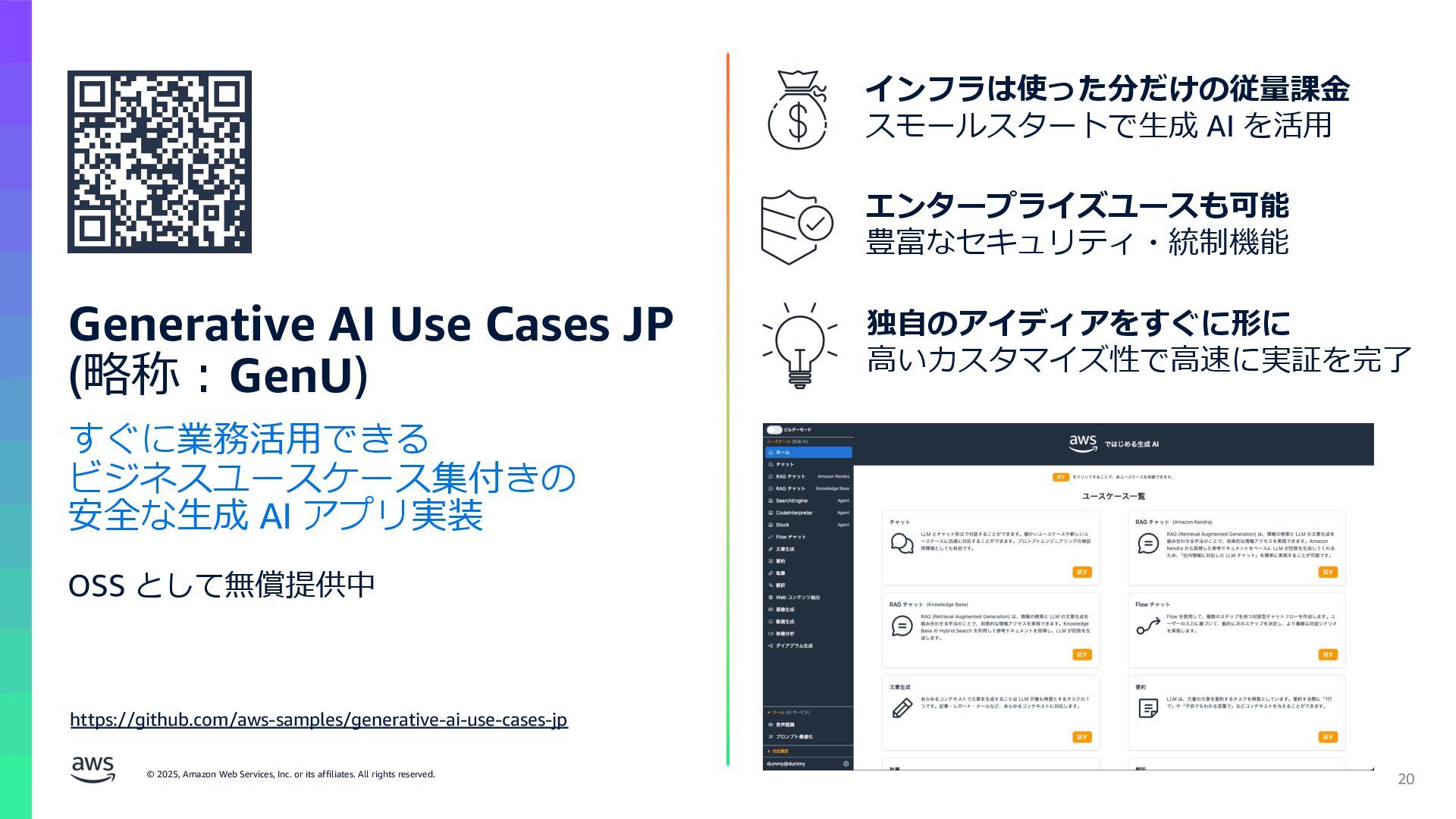 rights reserved. © 2025, Amazon Web Services, Inc. or its affiliates. All rights reserved. Generative AI Use Cases JP (略称︓GenU) すぐに業務活⽤できる ビジネスユースケース集付きの 安全な⽣成 AI アプリ実装 https://github.com/aws-samples/generative-ai-use-cases-jp OSS として無償提供中 インフラは使った分だけの従量課⾦ スモールスタートで⽣成 AI を活⽤ エンタープライズユースも可能 豊富なセキュリティ・統制機能 独⾃のアイディアをすぐに形に ⾼いカスタマイズ性で⾼速に実証を完了 20