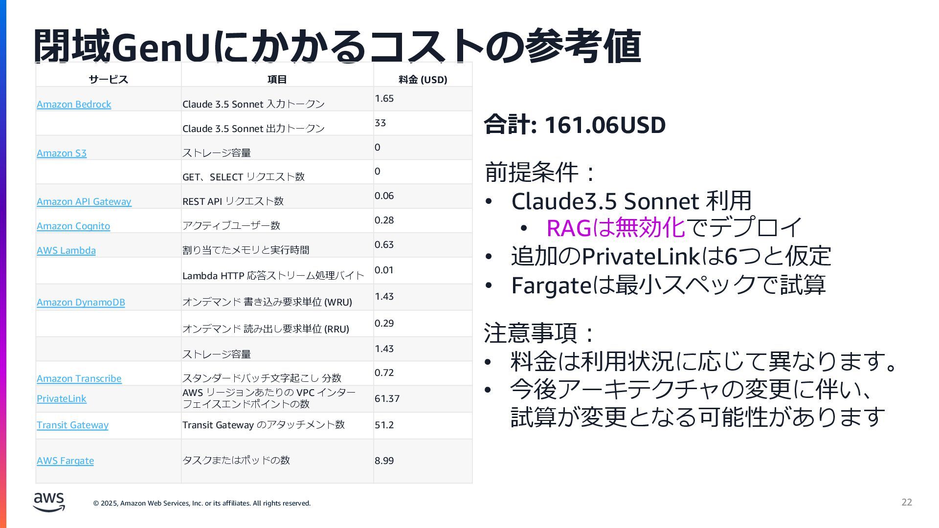 rights reserved. 22 閉域GenUにかかるコストの参考値 サービス 項⽬ 料⾦ (USD) Amazon Bedrock Claude 3.5 Sonnet ⼊⼒トークン 1.65 Claude 3.5 Sonnet 出⼒トークン 33 Amazon S3 ストレージ容量 0 GET、SELECT リクエスト数 0 Amazon API Gateway REST API リクエスト数 0.06 Amazon Cognito アクティブユーザー数 0.28 AWS Lambda 割り当てたメモリと実⾏時間 0.63 Lambda HTTP 応答ストリーム処理バイト 0.01 Amazon DynamoDB オンデマンド 書き込み要求単位 (WRU) 1.43 オンデマンド 読み出し要求単位 (RRU) 0.29 ストレージ容量 1.43 Amazon Transcribe スタンダードバッチ⽂字起こし 分数 0.72 PrivateLink AWS リージョンあたりの VPC インター フェイスエンドポイントの数 61.37 Transit Gateway Transit Gateway のアタッチメント数 51.2 AWS Fargate タスクまたはポッドの数 8.99 合計: 161.06USD 前提条件︓ • Claude3.5 Sonnet 利⽤ • RAGは無効化でデプロイ • 追加のPrivateLinkは6つと仮定 • Fargateは最⼩スペックで試算 注意事項︓ • 料⾦は利⽤状況に応じて異なります。 • 今後アーキテクチャの変更に伴い、 試算が変更となる可能性があります