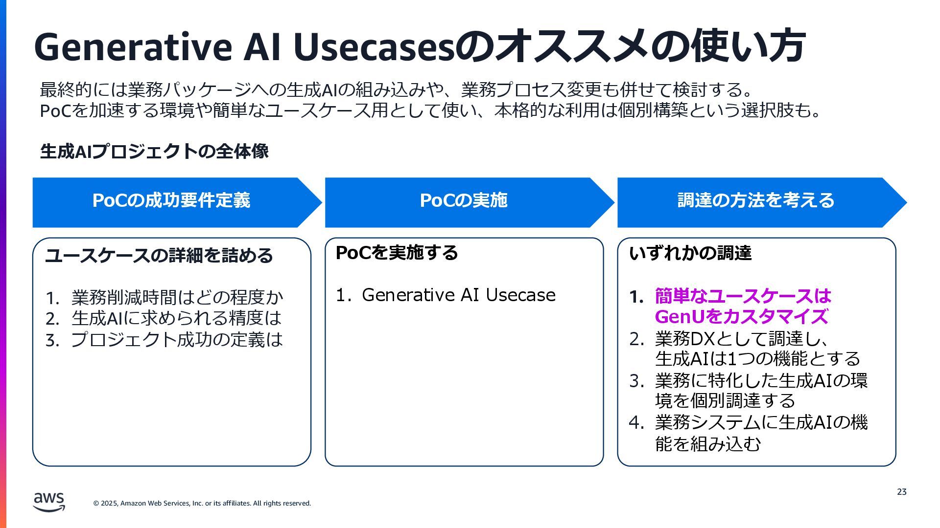 rights reserved. 23 Generative AI Usecasesのオススメの使い⽅ PoCの成功要件定義 PoCの実施 調達の⽅法を考える ユースケースの詳細を詰める 1. 業務削減時間はどの程度か 2. ⽣成AIに求められる精度は 3. プロジェクト成功の定義は PoCを実施する 1. Generative AI Usecase いずれかの調達 1. 簡単なユースケースは GenUをカスタマイズ 2. 業務DXとして調達し、 ⽣成AIは1つの機能とする 3. 業務に特化した⽣成AIの環 境を個別調達する 4. 業務システムに⽣成AIの機 能を組み込む 最終的には業務パッケージへの⽣成AIの組み込みや、業務プロセス変更も併せて検討する。 PoCを加速する環境や簡単なユースケース⽤として使い、本格的な利⽤は個別構築という選択肢も。 ⽣成AIプロジェクトの全体像
