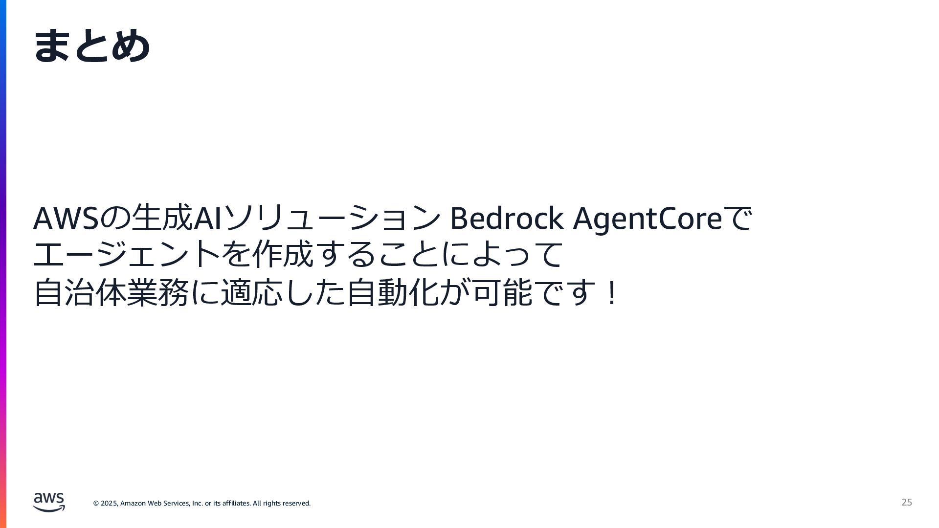 rights reserved. まとめ AWSの⽣成AIソリューション Bedrock AgentCoreで エージェントを作成することによって ⾃治体業務に適応した⾃動化が可能です︕ 25