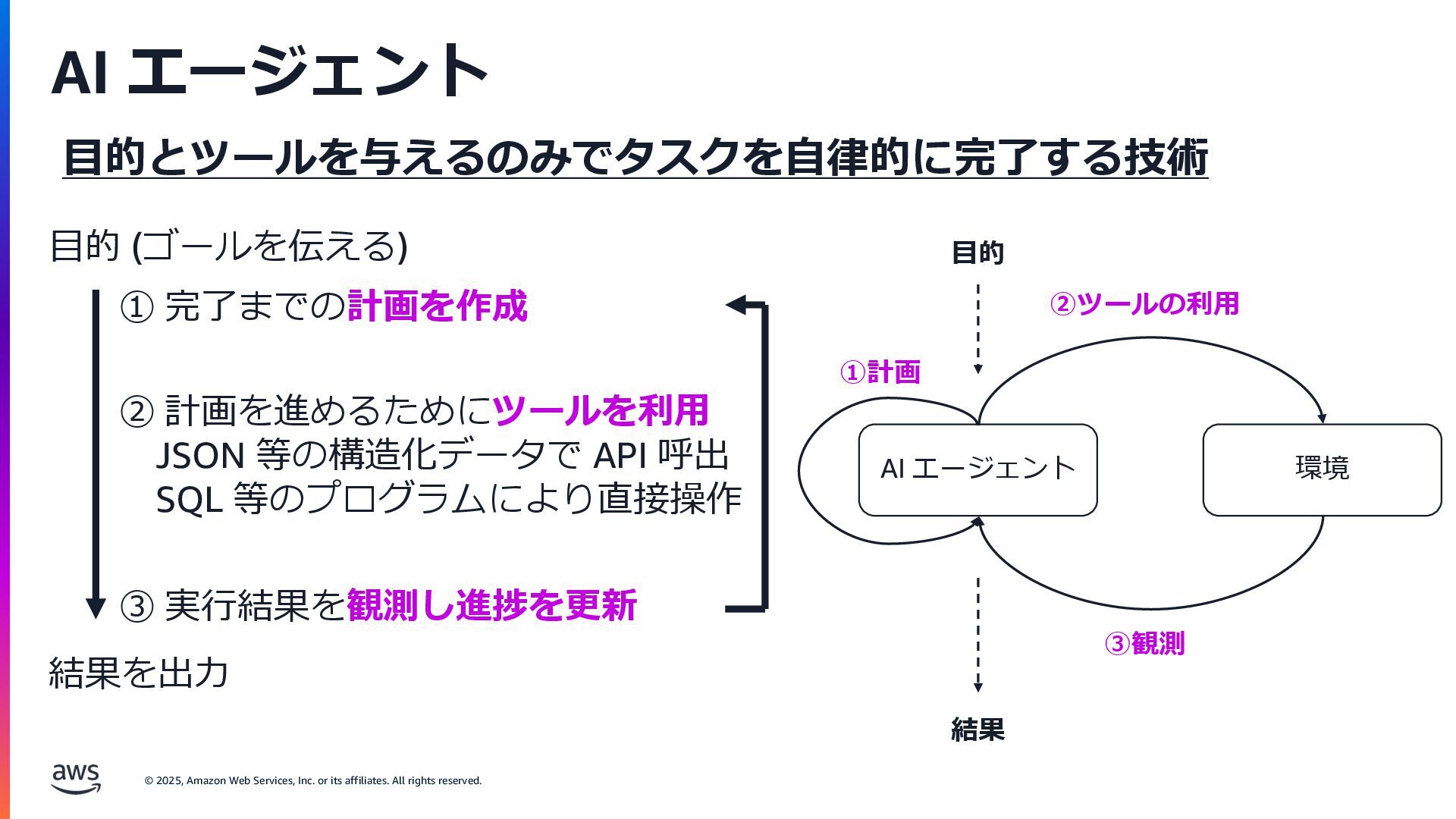 rights reserved. AI エージェント ⽬的 (ゴールを伝える) AI エージェント 環境 ②ツールの利⽤ ③観測 ⽬的 結果 ①計画 ⽬的とツールを与えるのみでタスクを⾃律的に完了する技術 ① 完了までの計画を作成 ② 計画を進めるためにツールを利⽤ JSON 等の構造化データで API 呼出 SQL 等のプログラムにより直接操作 ③ 実⾏結果を観測し進捗を更新 結果を出⼒