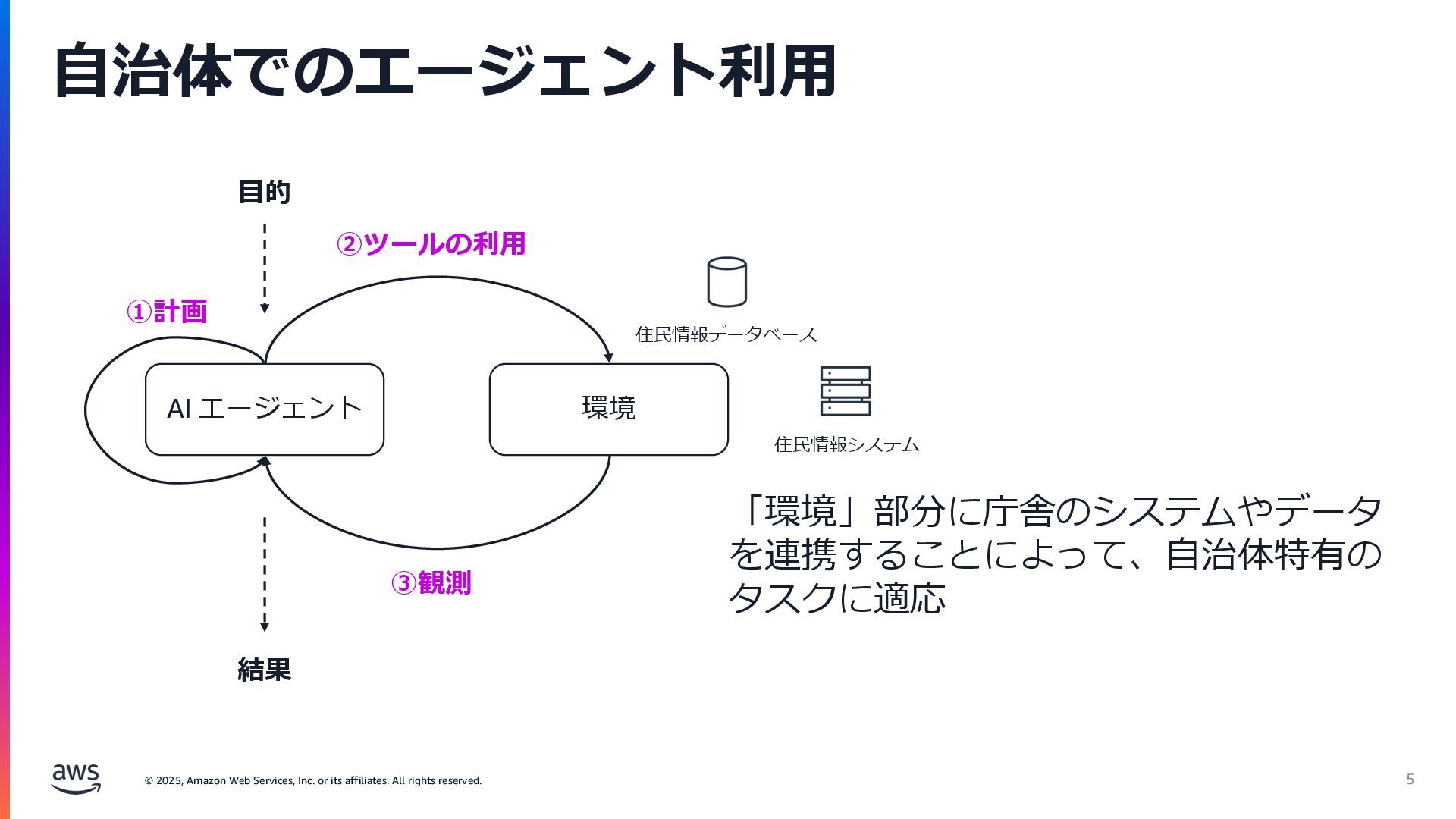 rights reserved. ⾃治体でのエージェント利⽤ 「環境」部分に庁舎のシステムやデータ を連携することによって、⾃治体特有の タスクに適応 5 AI エージェント 環境 ②ツールの利⽤ ③観測 ⽬的 結果 ①計画 住⺠情報データベース 住⺠情報システム