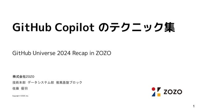 株式会社ZOZO 技術本部 データシステム部 推薦基盤ブロック 佐藤 優羽 GitHub Copilot のテクニック集 GitHub