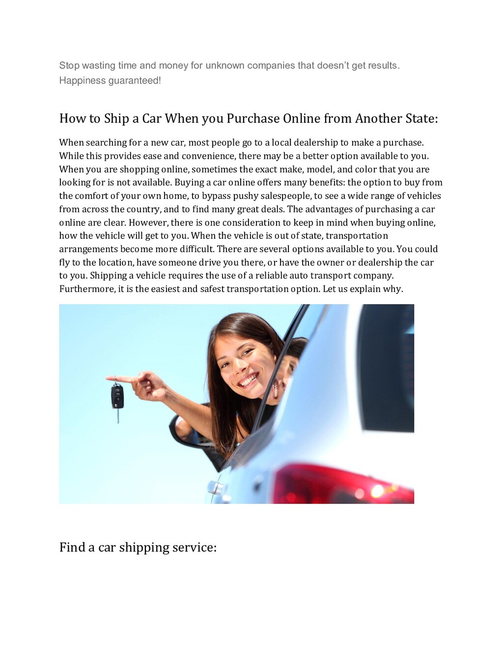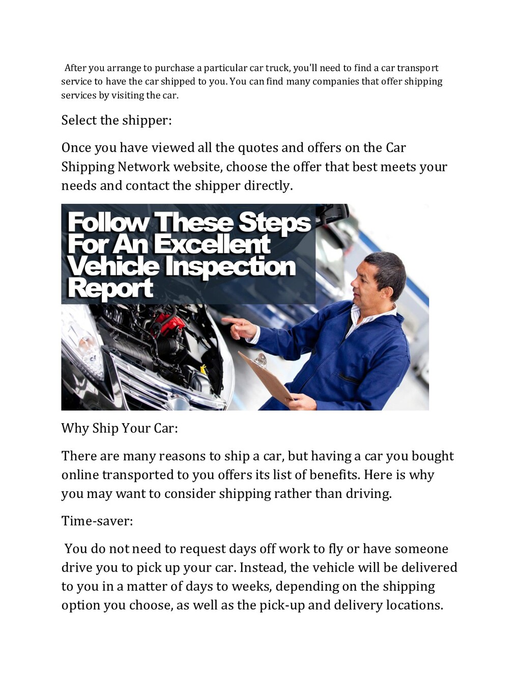 need to find a car transport service to have the car shipped to you. You can find many companies that offer shipping services by visiting the car. Select the shipper: Once you have viewed all the quotes and offers on the Car Shipping Network website, choose the offer that best meets your needs and contact the shipper directly. Why Ship Your Car: There are many reasons to ship a car, but having a car you bought online transported to you offers its list of benefits. Here is why you may want to consider shipping rather than driving. Time-saver: You do not need to request days off work to fly or have someone drive you to pick up your car. Instead, the vehicle will be delivered to you in a matter of days to weeks, depending on the shipping option you choose, as well as the pick-up and delivery locations.