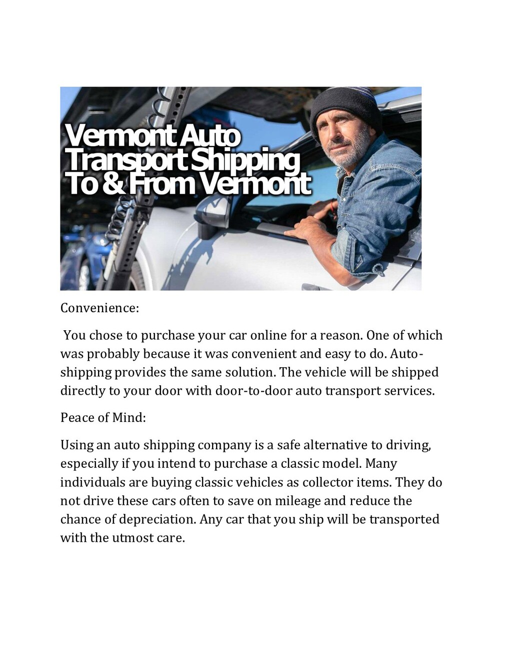 reason. One of which was probably because it was convenient and easy to do. Auto- shipping provides the same solution. The vehicle will be shipped directly to your door with door-to-door auto transport services. Peace of Mind: Using an auto shipping company is a safe alternative to driving, especially if you intend to purchase a classic model. Many individuals are buying classic vehicles as collector items. They do not drive these cars often to save on mileage and reduce the chance of depreciation. Any car that you ship will be transported with the utmost care.