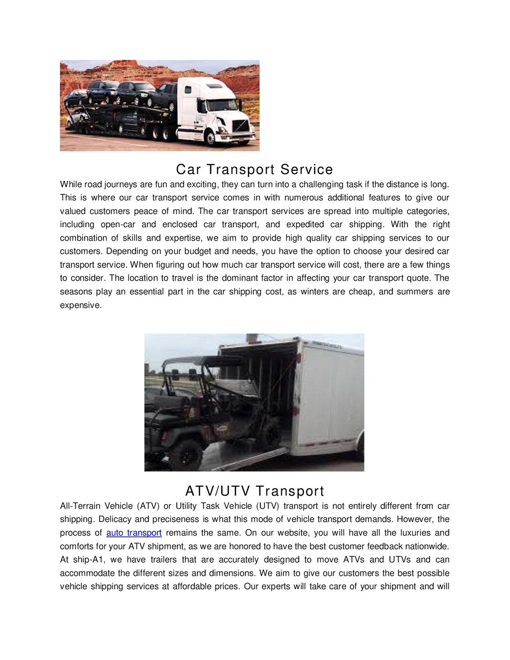 they can turn into a challenging task if the distance is long. This is where our car transport service comes in with numerous additional features to give our valued customers peace of mind. The car transport services are spread into multiple categories, including open-car and enclosed car transport, and expedited car shipping. With the right combination of skills and expertise, we aim to provide high quality car shipping services to our customers. Depending on your budget and needs, you have the option to choose your desired car transport service. When figuring out how much car transport service will cost, there are a few things to consider. The location to travel is the dominant factor in affecting your car transport quote. The seasons play an essential part in the car shipping cost, as winters are cheap, and summers are expensive. ATV/UTV Transport All-Terrain Vehicle (ATV) or Utility Task Vehicle (UTV) transport is not entirely different from car shipping. Delicacy and preciseness is what this mode of vehicle transport demands. However, the process of auto transport remains the same. On our website, you will have all the luxuries and comforts for your ATV shipment, as we are honored to have the best customer feedback nationwide. At ship-A1, we have trailers that are accurately designed to move ATVs and UTVs and can accommodate the different sizes and dimensions. We aim to give our customers the best possible vehicle shipping services at affordable prices. Our experts will take care of your shipment and will