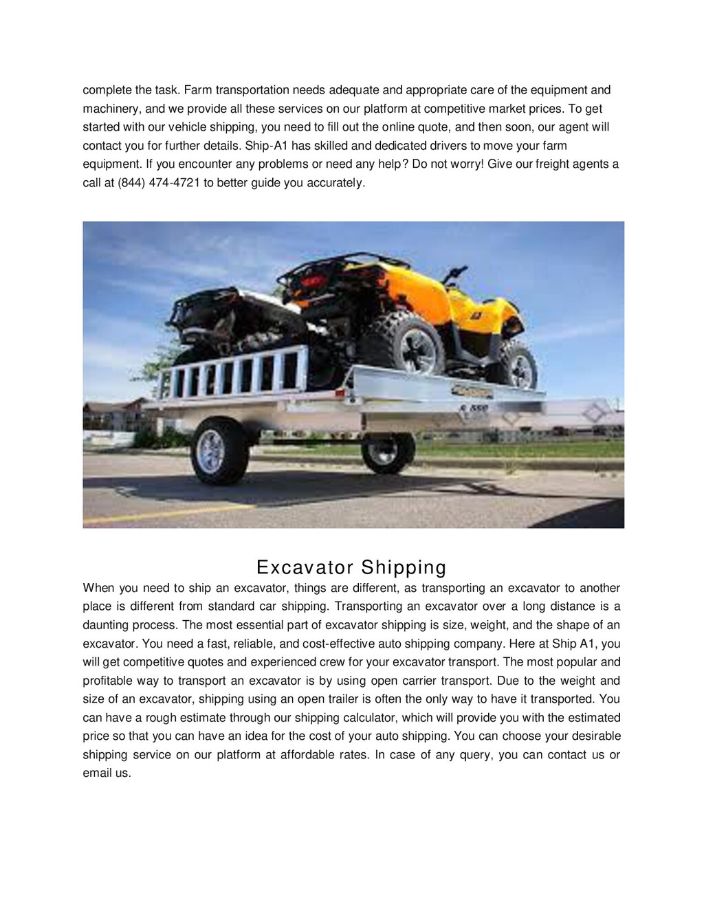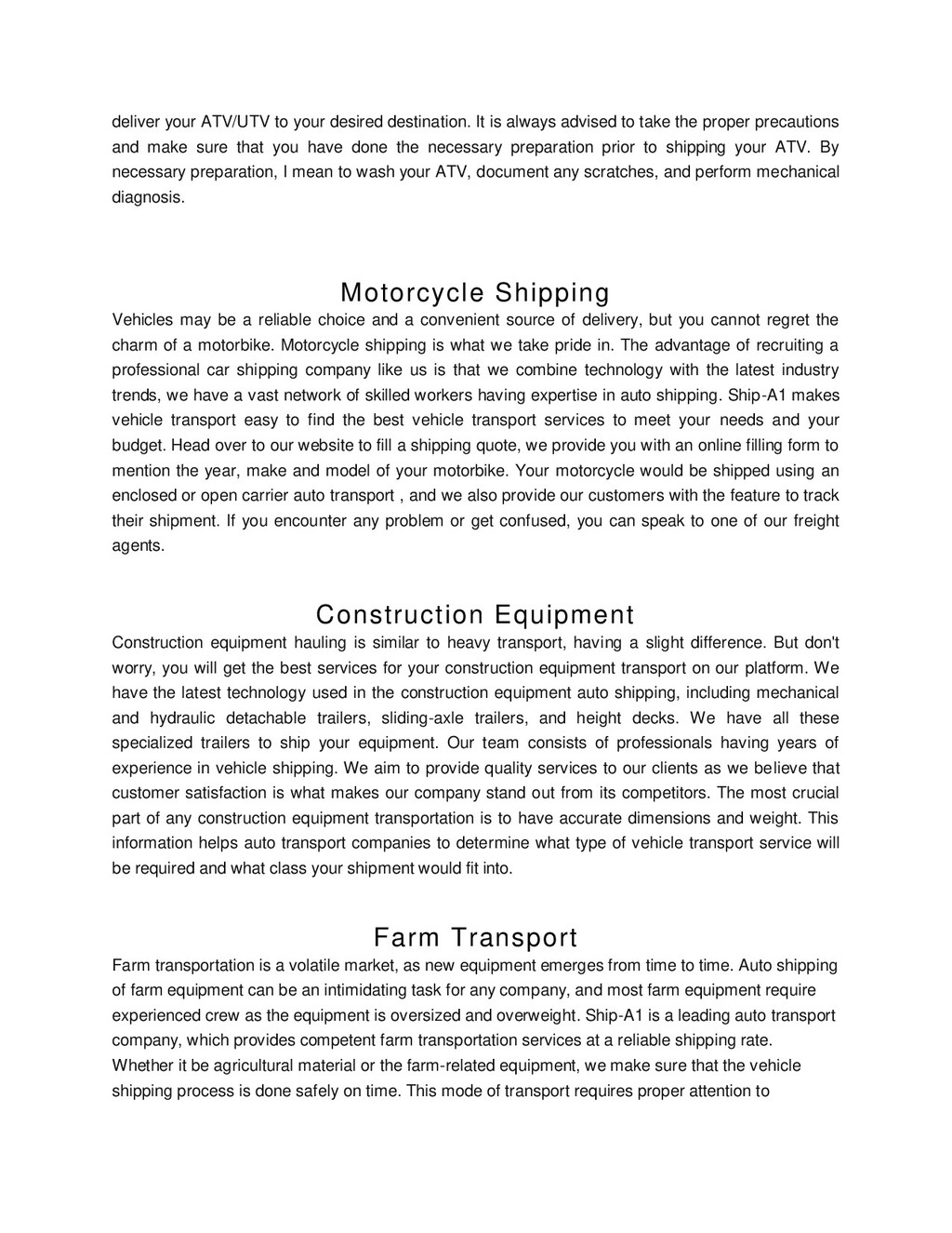 advised to take the proper precautions and make sure that you have done the necessary preparation prior to shipping your ATV. By necessary preparation, I mean to wash your ATV, document any scratches, and perform mechanical diagnosis. Motorcycle Shipping Vehicles may be a reliable choice and a convenient source of delivery, but you cannot regret the charm of a motorbike. Motorcycle shipping is what we take pride in. The advantage of recruiting a professional car shipping company like us is that we combine technology with the latest industry trends, we have a vast network of skilled workers having expertise in auto shipping. Ship-A1 makes vehicle transport easy to find the best vehicle transport services to meet your needs and your budget. Head over to our website to fill a shipping quote, we provide you with an online filling form to mention the year, make and model of your motorbike. Your motorcycle would be shipped using an enclosed or open carrier auto transport , and we also provide our customers with the feature to track their shipment. If you encounter any problem or get confused, you can speak to one of our freight agents. Construction Equipment Construction equipment hauling is similar to heavy transport, having a slight difference. But don't worry, you will get the best services for your construction equipment transport on our platform. We have the latest technology used in the construction equipment auto shipping, including mechanical and hydraulic detachable trailers, sliding-axle trailers, and height decks. We have all these specialized trailers to ship your equipment. Our team consists of professionals having years of experience in vehicle shipping. We aim to provide quality services to our clients as we believe that customer satisfaction is what makes our company stand out from its competitors. The most crucial part of any construction equipment transportation is to have accurate dimensions and weight. This information helps auto transport companies to determine what type of vehicle transport service will be required and what class your shipment would fit into. Farm Transport Farm transportation is a volatile market, as new equipment emerges from time to time. Auto shipping of farm equipment can be an intimidating task for any company, and most farm equipment require experienced crew as the equipment is oversized and overweight. Ship-A1 is a leading auto transport company, which provides competent farm transportation services at a reliable shipping rate. Whether it be agricultural material or the farm-related equipment, we make sure that the vehicle shipping process is done safely on time. This mode of transport requires proper attention to