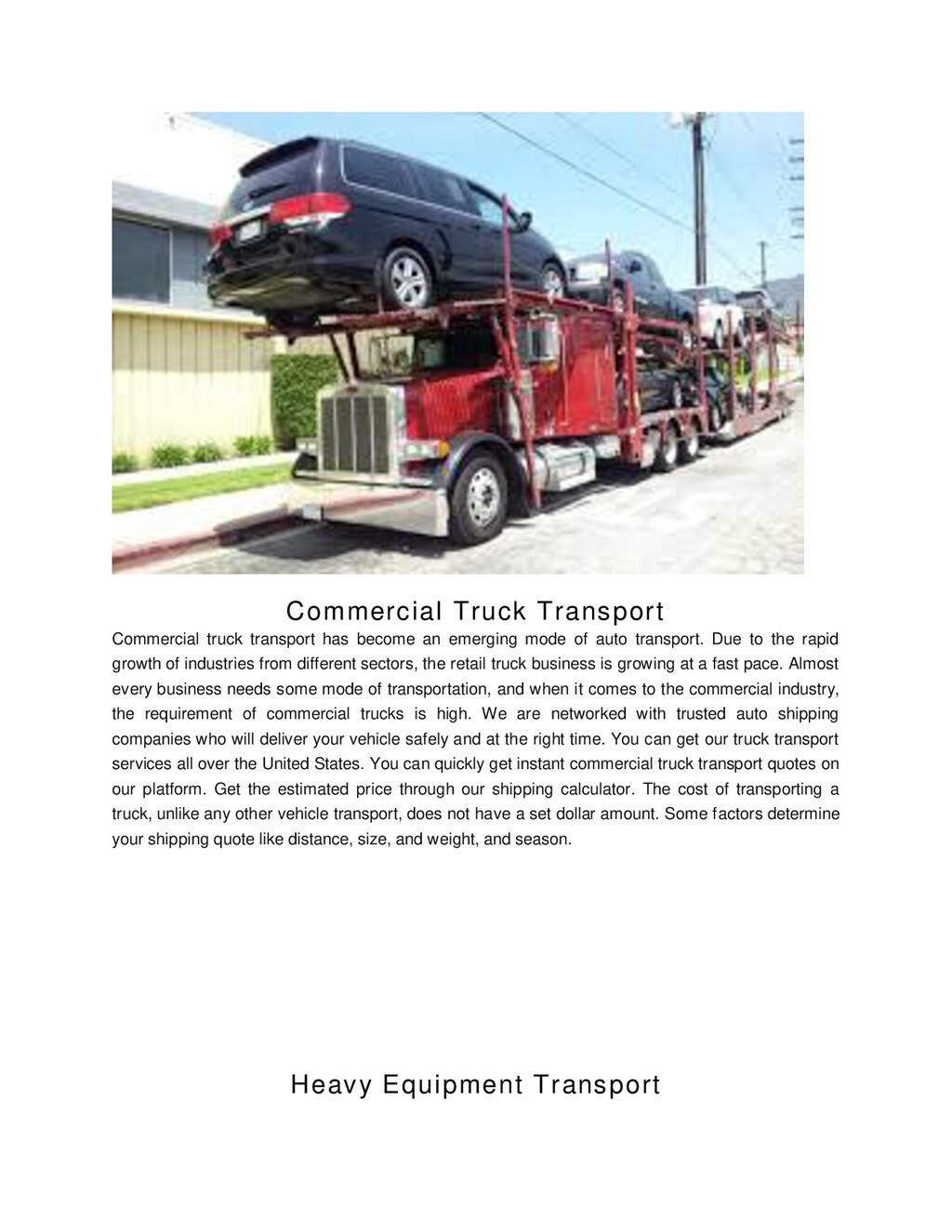 mode of auto transport. Due to the rapid growth of industries from different sectors, the retail truck business is growing at a fast pace. Almost every business needs some mode of transportation, and when it comes to the commercial industry, the requirement of commercial trucks is high. We are networked with trusted auto shipping companies who will deliver your vehicle safely and at the right time. You can get our truck transport services all over the United States. You can quickly get instant commercial truck transport quotes on our platform. Get the estimated price through our shipping calculator. The cost of transporting a truck, unlike any other vehicle transport, does not have a set dollar amount. Some factors determine your shipping quote like distance, size, and weight, and season. Heavy Equipment Transport