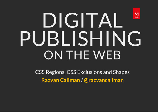 Slides for my talk at Kings of Code in Asterdam, 2012 about using CSS Regions and CSS Exclusions & Shapes as building blocks for digital publications layout.