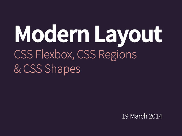 Supporting slides for a workshop on new layout capabilities in CSS: Flexbox, Regions and Shapes. London, 2014.