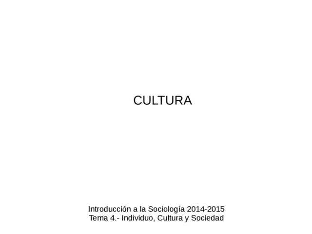 Sociedad • Componentes cognitivos y valorativos de la cultura Entendimientos compartidos acerca de cómo es el mundo y cómo debería seguir siendo (mapas cognitivos, valores, visiones del mundo) • Artefactos culturales Construcciones artificiales a lo largo del tiempo – Tangibles (creaciones adaptativas, tecnología, arte) – Intangibles (reglas, costumbres, instituciones) que dicen cómo se hacen las cosas (Roberto Garvía, Conceptos fundamentales de Sociología)