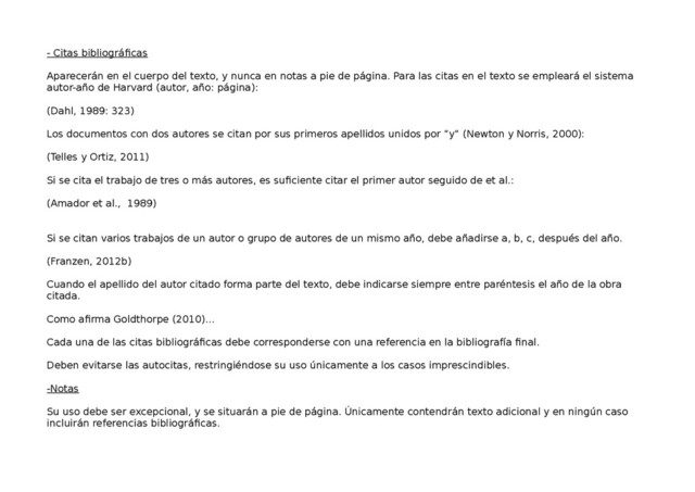 citadas en el texto. Queda expresamente prohibido incluir referencias adicionales. Se seguirá el sistema Harvard. Las autorías se ordenarán alfabéticamente. Las normas que se deben seguir a la hora de citar la bibliografía al final del texto son las siguientes: a. Apellido(s), Nombre. Se utilizará la forma desarrollada del nombre. Si el nombre es compuesto, debe desarrollarse el primero y a partir del segundo usarse solo la inicial. En caso de autoría múltiple los autores irán separados por comas, excepto el último que llevará “y”. A partir del segundo autor, el nombre se escribirá en orden directo: nombre, apellido. Si se da el caso de que la obra tenga varios autores sin especificar, se pondrá VV. AA. Sageman, Marc y Bruce Hoffman. 2008. “Does Osama still call the shots? Debating the containment of al Qaeda’s leadership”, Foreing Affairs, 87 (4): 4163-166 VV.AA. 2003. Introducción a la economía y administración de empresas, Madrid: Ediciones Pirámide. b. Cuando en el listado bibliográfico aparecen varias obras de un mismo autor, se listarán siguiendo un estricto orden cronológico, comenzando con la más antigua. El apellido y nombre siempre adoptará la misma forma en todas las referencias. Navarro, Clemente J. 2000. “El sesgo participativo. Introducción a la teoría empírica de la democracia participativa”, Papers, 61: 11-37. Navarro, Clemente J. 2002. Democracia asociativa y oportunismo político. Valencia: Tirant lo Blanch. c. El año de publicación debe incluir a, b, c, etc. en caso de que exista en la bibliografía más de una obra del autor fechada en el mismo año (por ej.: 2008a, 2008b, etc.). Rancière, Jacques. 2006a. “Diez tesis sobre la política”, en Política, policía, democracia, Santiago de Chile: Ediciones Lom. Rancière, Jacques. 2006b. “Política, identificación, subjetivación”, en Polític, policía, democracia, Santiago de Chile: Ediciones Lom.