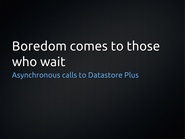 = [] for i in range(10): for i in range(10): futures.append(Fact(text = 'Fact %d' % \ futures.append(Fact(text = 'Fact %d' % \ i).put_async()) i).put_async()) [ f.get_result() for f in futures ] [ f.get_result() for f in futures ] Gives the opportunity to aggregate puts into one large datastore Gives the opportunity to aggregate puts into one large datastore operation (and we don't have to worry about it) operation (and we don't have to worry about it)