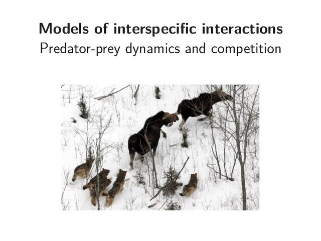 dynamics and competitive interactions • As usual, these models were developed as continuous-time models • We will focus on discrete-time versions (t = 1, 2, . . .) • We will ignore potential extensions with stochasticity, age structure, spatial structure, etc. . . Introduction Predator-Prey Competition 2 / 14