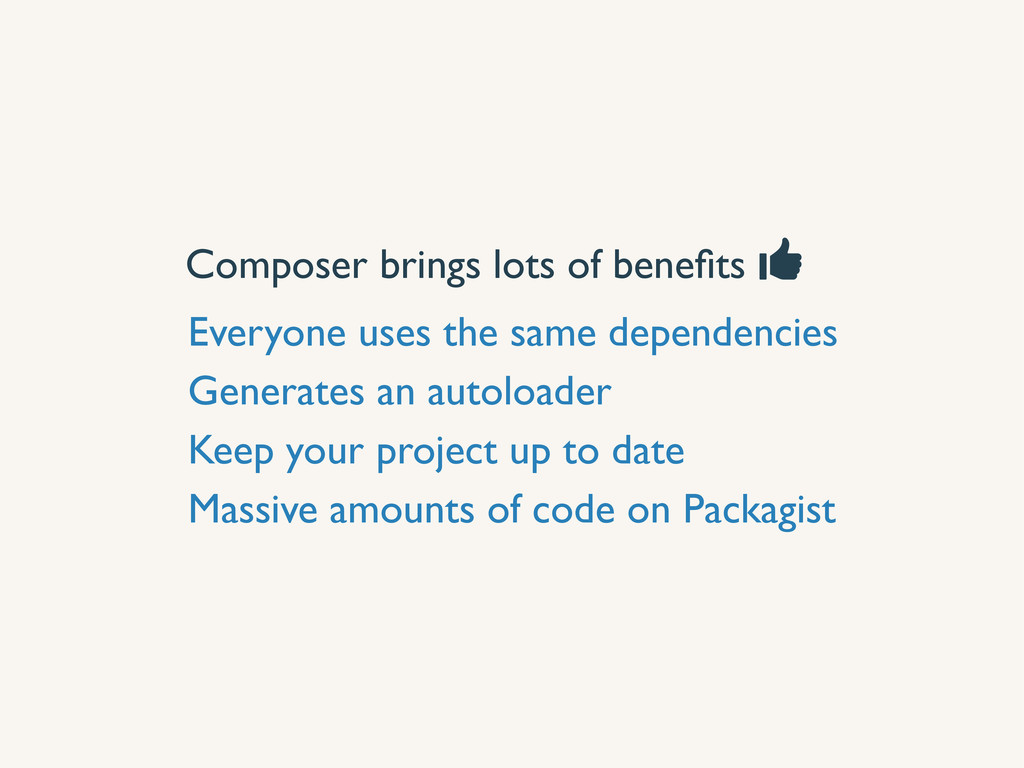 Generates an autoloader Keep your project up to date Massive amounts of code on Packagist