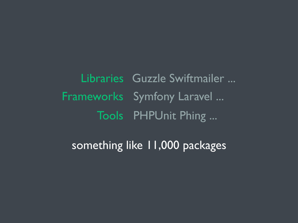 Libraries Guzzle Swiftmailer ... Frameworks Symfony Laravel ... Tools PHPUnit