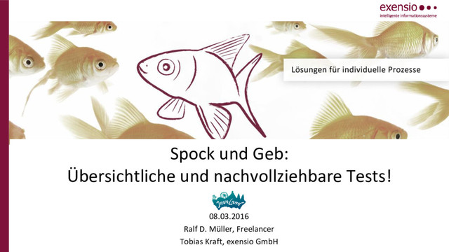 für alle! Vortrag, Beispiele Source Code http://rdmueller.github.io/etka15/ • Teil 1 : Mit Mr. Spock beim Testeinsatz, Javamagazin (12/2014) Teil 2 : Mr. Spock ruft Geb, Javamagazin (01/2015) http://www.exensio.de/articles/