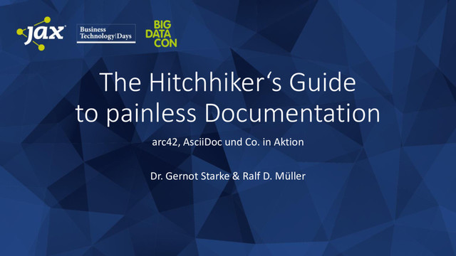 an email • modular • reference Images – don‘t embedd them • integration of Source-Code • Reviews, Pull-Requests, Versionierung with Git • convert to HTML5, DocBook etc.