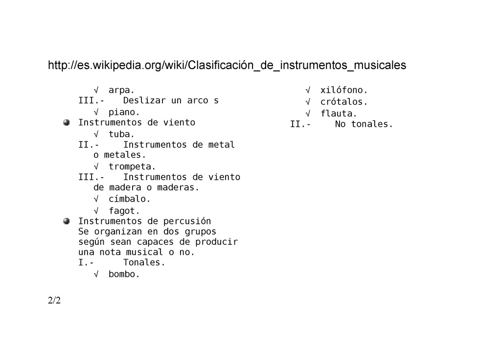 nivel de esta clasificación está dado por el elemento vibrante que produce el sonido. Por consiguiente, los instrumentos se clasifican en: E A) Cordófonos. El elemento vibrante es una cuerda. B) Aerófonos. El elemento vibrante es el aire. C) Membranófonos. El elemento vibrante es una membrana. D) Ideófonos- El mismo instrumento es lo que vibra. E) Electrófonos . el sonido es creado o modificado mediante circuitos eléctricos. La clasificación clásica es (en el mismo orden): Instrumentos de cuerda: Los tres métodos más comunes para que un instrumento de cuerda produzca sonido son: I.- obre las cuerdas para hacerlas vibrar. √ violín. √ contrabajo. II.- Golpear las cuerdas con martillosPuntear con los dedos o con un plectro. √ guitarra. 1/2