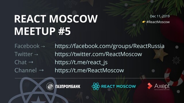 19:20 - 19:30 Вступительное слово Денис Измайлов, Axept 19:30 - 20:00 Хоки и хуки Дмитрий Григоров, Газпромбанк 20:00 - 20:40 Море проблем: миграция с легаси на React.js! Олег Коровин, Одноклассники 20:40 - 21:00 Обед и кофе-брейк 21:00 - 21:30 Мы не знаем, кто использует наше приложение Кир Дергачев, Mos.Ru 21:30 - 22:00 Почему мы выбрали MobX, а не Redux? Назим Гафаров, Mail.Ru Cloud Solutions