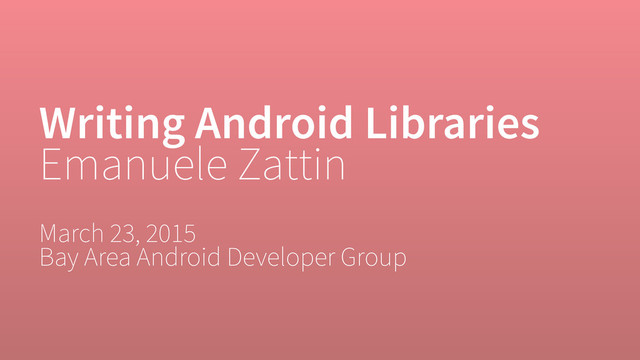 1 -k it.droidcon.awesomelib -p . -g -v 1.1.3 -t: target (Use android list targets to get a list of target ids) -k: package name -p: path to the project -g: make it a Gradle project (requires SDK >= 19) -v: version of the Android Gradle plugin to use Step one: Getting started!