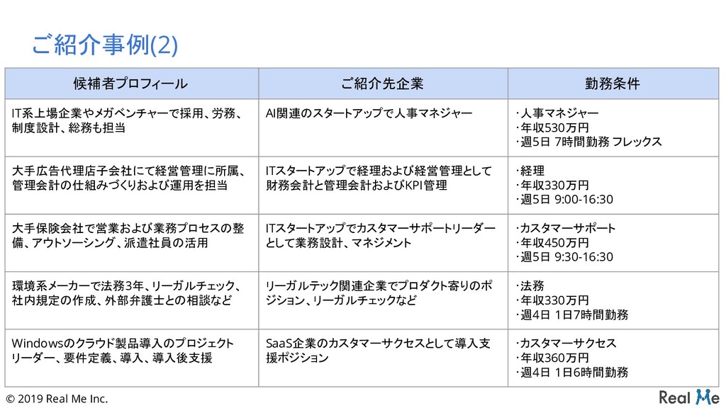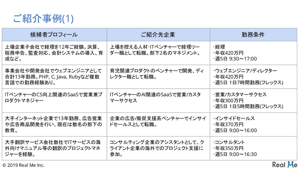 税務申告、監査対応、会計システムの導入、育 成など。 上場を控える人材・ITベンチャーで経理リー ダー職として転職。部下2名のマネジメント。 ・経理 ・年収420万円 ・週5日 9:30~17:00 事業会社や開発会社でウェブエンジニアとして 合計13年勤務。PHP, C, Java, Rubyなど複数 言語での勤務経験あり。 育児関連プロダクトのベンチャーで開発、ディ レクター職として転職。 ・ウェブエンジニア/ディレクター ・年収420万円 ・週5日 1日7時間勤務(フレックス) ITベンチャーのCS向上関連のSaaSで営業兼プ ロダクトマネジャー ITベンチャーのAI関連のSaaSで営業/カスタ マーサクセス ・営業/カスタマーサクセス ・年収300万円 ・週5日 1日5時間勤務(フレックス) 大手インターネット企業で13年勤務、広告営業 や広告商品開発を行い、現在は数名の部下の 教育。 企業の広告/販促支援系ベンチャーでインサイ ドセールスとして転職。 ・インサイドセールス ・年収370万円 ・週5日 9:00~16:00 大手翻訳サービス会社数社でITサービスの海 外向けマニュアル等の翻訳のプロジェクトマネ ジャーを経験。 コンサルティング企業のアシスタントとして、ク ライアント企業の海外でのプロジェクト支援に 参加。 ・コンサルタント ・年収350万円 ・週5日 9:00~16:30