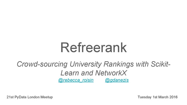 from DBLP by matched REF author • Build directed graph from included to non-included venues • Compute stationary distribution over normalized graph to get venue ranking score • Combine venue rankings for all academics in an institution to produce new ranking ◦ top 4 papers (REF-like) ◦ all relevant papers