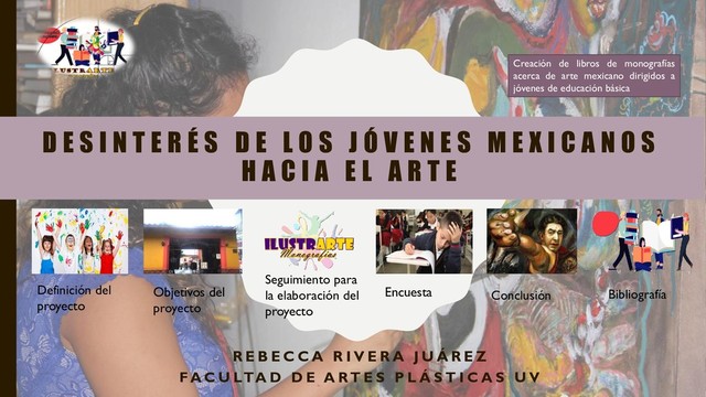 del proyecto Encuesta Conclusión Bibliografía Decidí llevar a cabo el desarrollo de mi proyecto enfocándome en la problemática del desinterés existente en la sociedad juvenil mexicana hacia el arte. Como estudiante de artes visuales, en conjunto con compañeros de mi misma carrera y catedráticos, hemos analizado y debatido en diversas ocasiones esta temática; actualmente, los jóvenes han perdido el entusiasmo de adentrarse hacia el arte, no sólo de manera práctica, sino también en el aspecto teórico. Muchos, o la gran mayoría de los jóvenes tienen un nulo conocimiento de la historia del arte del país, lo cual es preocupante. Encontré varios artículos de interés acerca de la historia del arte mexicano, los cuales opino que son de gran ayuda para aquellos que deseen o necesiten empaparse del tema. De igual manera, encontré artículos que hablan acerca de las principales causas del creciente desinterés de la sociedad mexicana hacia las artes visuales/plásticas. Es lamentable que, siendo un país con una enorme riqueza cultural, seamos también un país que no le da la importancia que se merece a las diversas manifestaciones artísticas que se practican en México. El artículo que propongo como una probable solución a esta problemática, es la creación de un libro de monografías con la historia de los artistas y los movimientos artísticos más relevantes del siglo XX en México; este libro, al ser en su mayoría de carácter gráfico, podrá llamar la atención de los jóvenes y envolverlos de mejor manera para su lectura. DEFINICIÓN DEL PROYECTO
