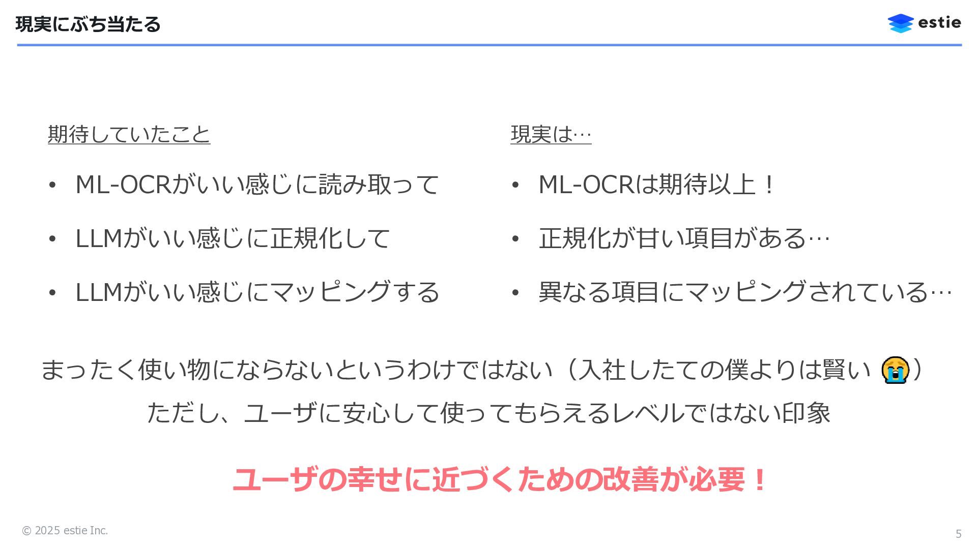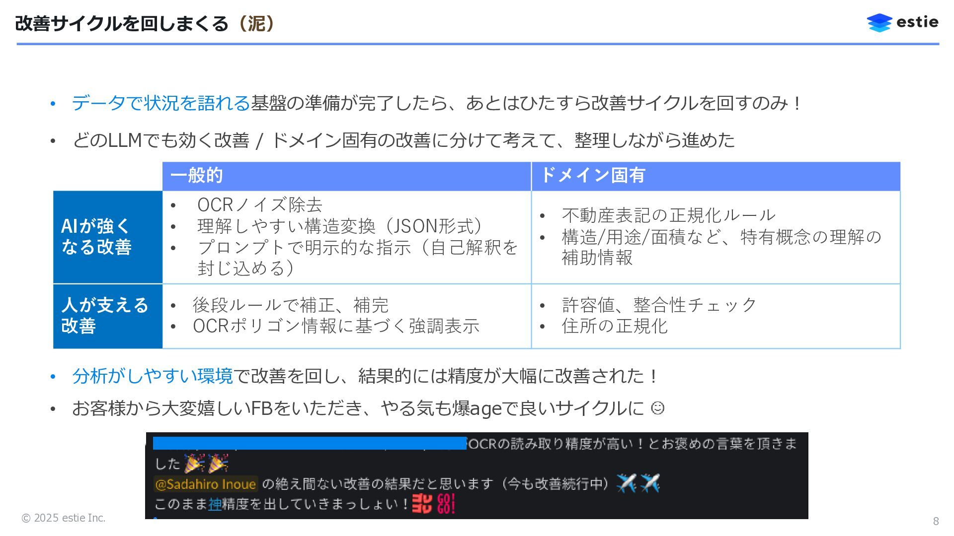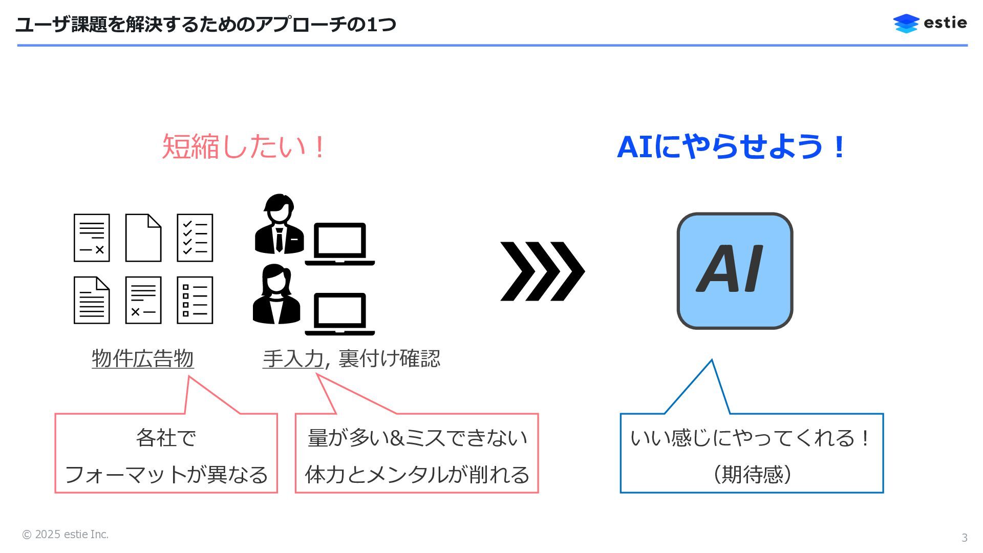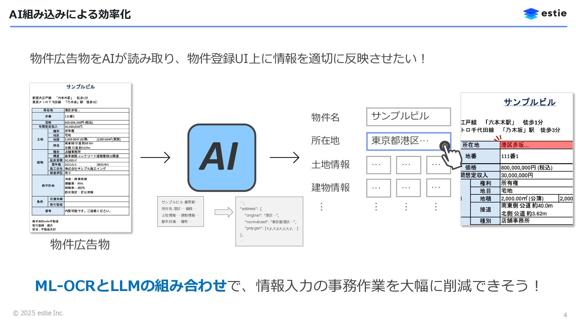 土地情報 建物情報 サンプルビル … … ︙ ︙ … … … … ︙ ︙ 物件広告物をAIが読み取り、物件登録UI上に情報を適切に反映させたい! 物件広告物 ML-OCRとLLMの組み合わせで、情報入力の事務作業を大幅に削減できそう! サンプルビル 最寄駅… 所在地 港区… 価格… 土地情報… 建物情報… 都市計画… 備考… …, “address”: { “original”: “港区…”, “normalized”: “東京都港区…”, “polygon”: [x,y,x,y,x,y,x,y,…] }, …