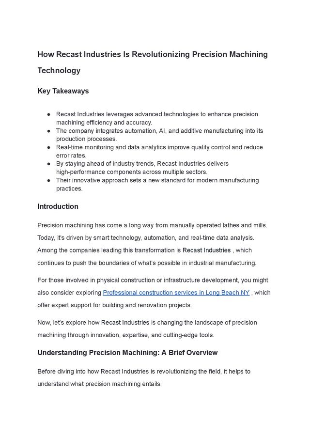 Industries is actively preparing for this future by investing in research and development and forming partnerships with tech innovators. Industry 4.0 Integration Industry 4.0 concepts—like digital twins, augmented reality (AR) for maintenance, and blockchain for supply chain transparency—are being explored at Recast Industries. These technologies will further streamline operations and improve decision-making. Expanding Into New Markets As global demand for high-precision parts grows, Recast Industries is positioning itself to serve emerging markets such as renewable energy, robotics, and space exploration. Conclusion Recast Industries is redefining what’s possible in precision machining through its commitment to innovation, quality, and sustainability. By embracing automation, data analytics, and advanced materials, the company continues to raise the bar for modern manufacturing. If you're looking for expert support in physical construction or building projects, consider checking out Professional construction services in Long Beach NY , which provide reliable and skilled assistance for residential and commercial developments. Ultimately, whether you're developing aerospace components, medical devices, or custom industrial equipment, Recast Industries offers the technological expertise and precision needed to bring your vision to life.