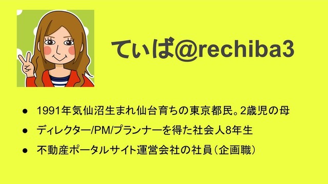 てぃば@rechiba3 • 1991年気仙沼生まれ仙台育ちの東京都民。2歳児の母 • ディレクター/PM/プランナーを得た社会人8年生 • 不動産ポータルサイト運営会社の社員(企画職)