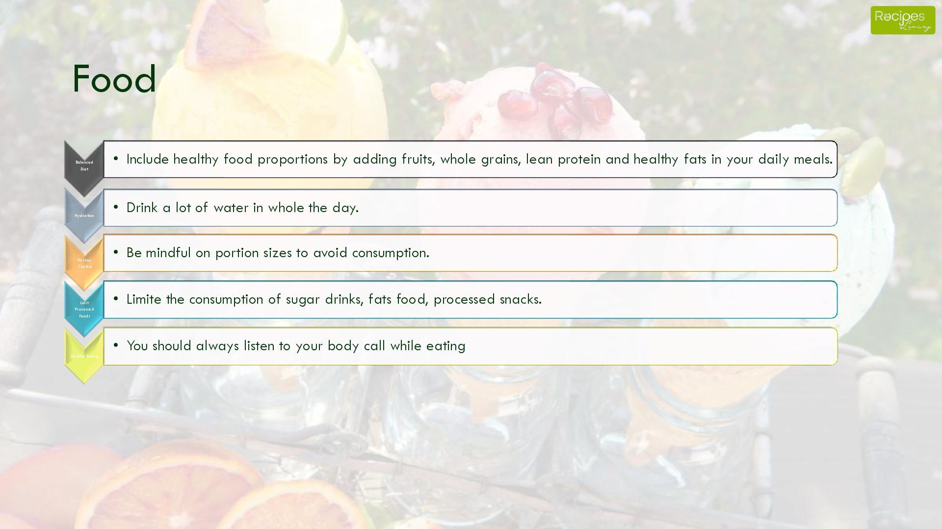 fruits, whole grains, lean protein and healthy fats in your daily meals. Hydration • Drink a lot of water in whole the day. Portion Control • Be mindful on portion sizes to avoid consumption. Limit Processed Foods • Limite the consumption of sugar drinks, fats food, processed snacks. Mindful Eating • You should always listen to your body call while eating