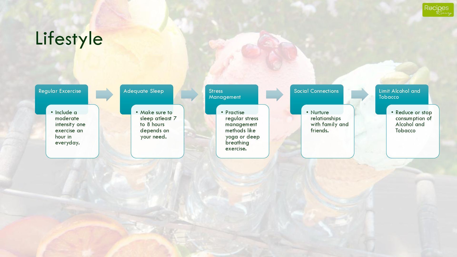 an hour in everyday. Adequate Sleep • Make sure to sleep atleast 7 to 8 hours depends on your need. Stress Management • Practise regular stress management methods like yoga or deep breathing exercise. Social Connections • Nurture relationships with family and friends. Limit Alcohol and Tobacco • Reduce or stop consumption of Alcohol and Tobacco