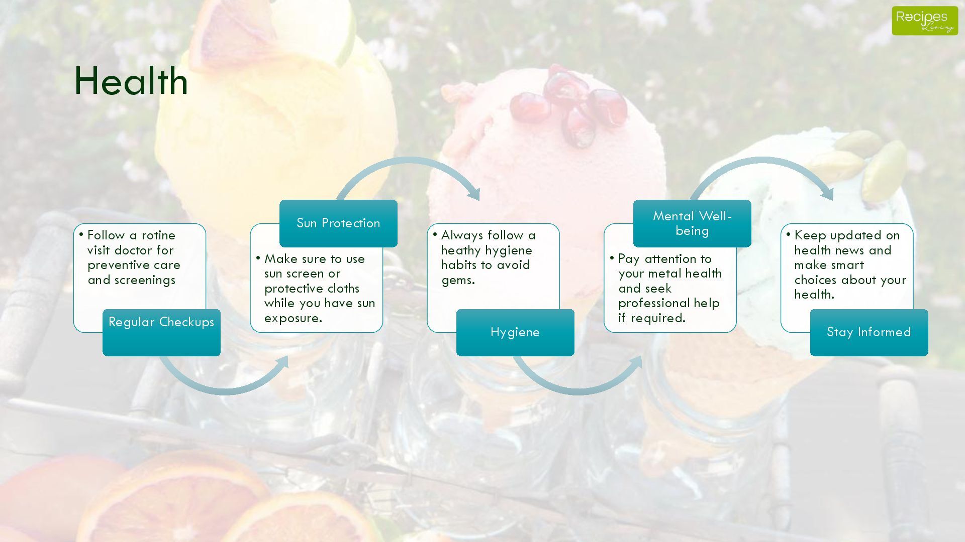 and screenings Regular Checkups • Make sure to use sun screen or protective cloths while you have sun exposure. Sun Protection • Always follow a heathy hygiene habits to avoid gems. Hygiene • Pay attention to your metal health and seek professional help if required. Mental Well- being • Keep updated on health news and make smart choices about your health. Stay Informed