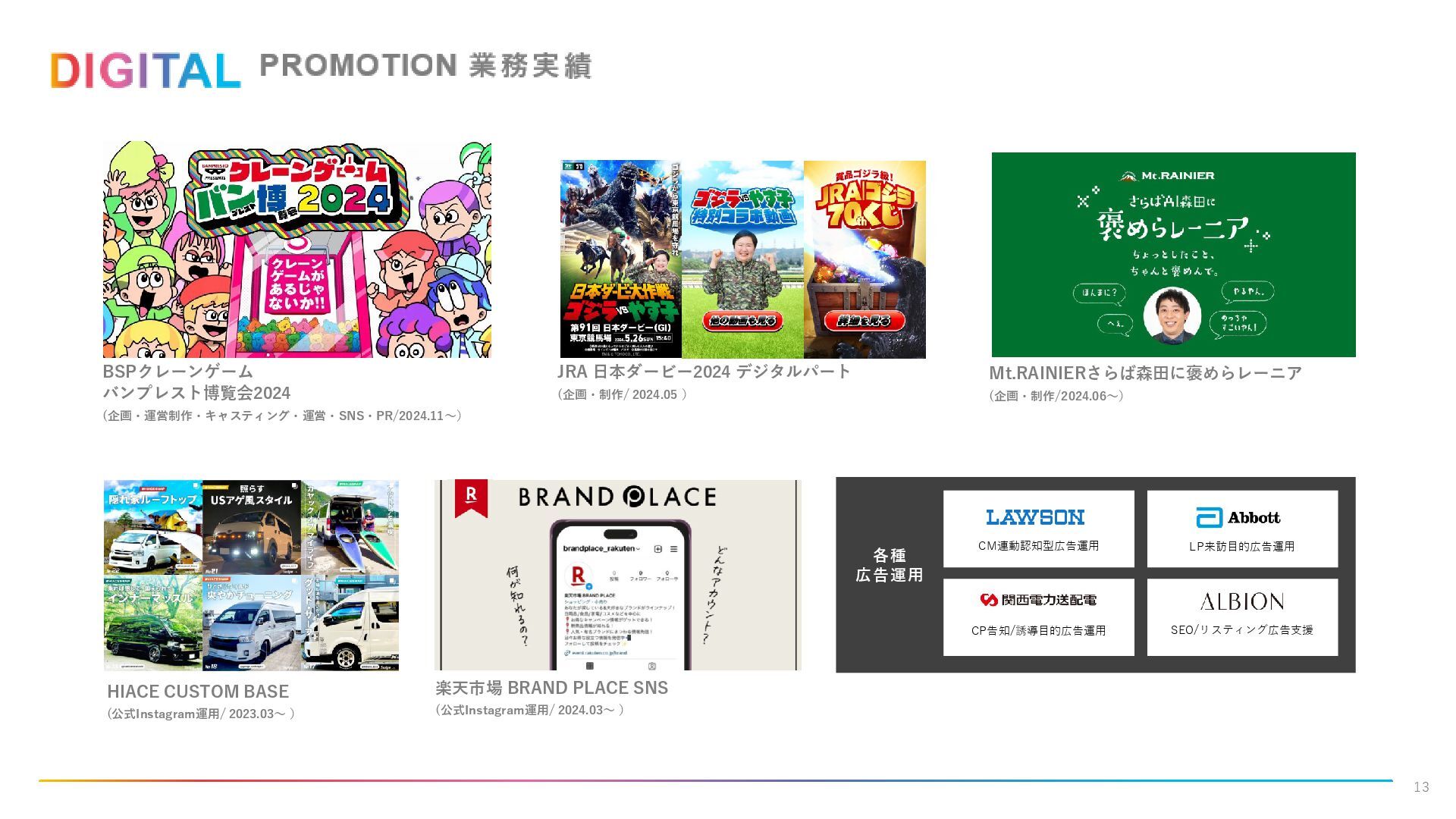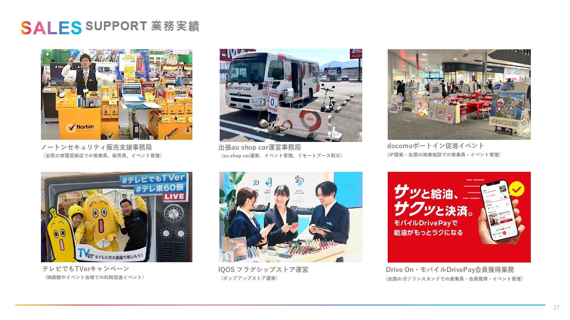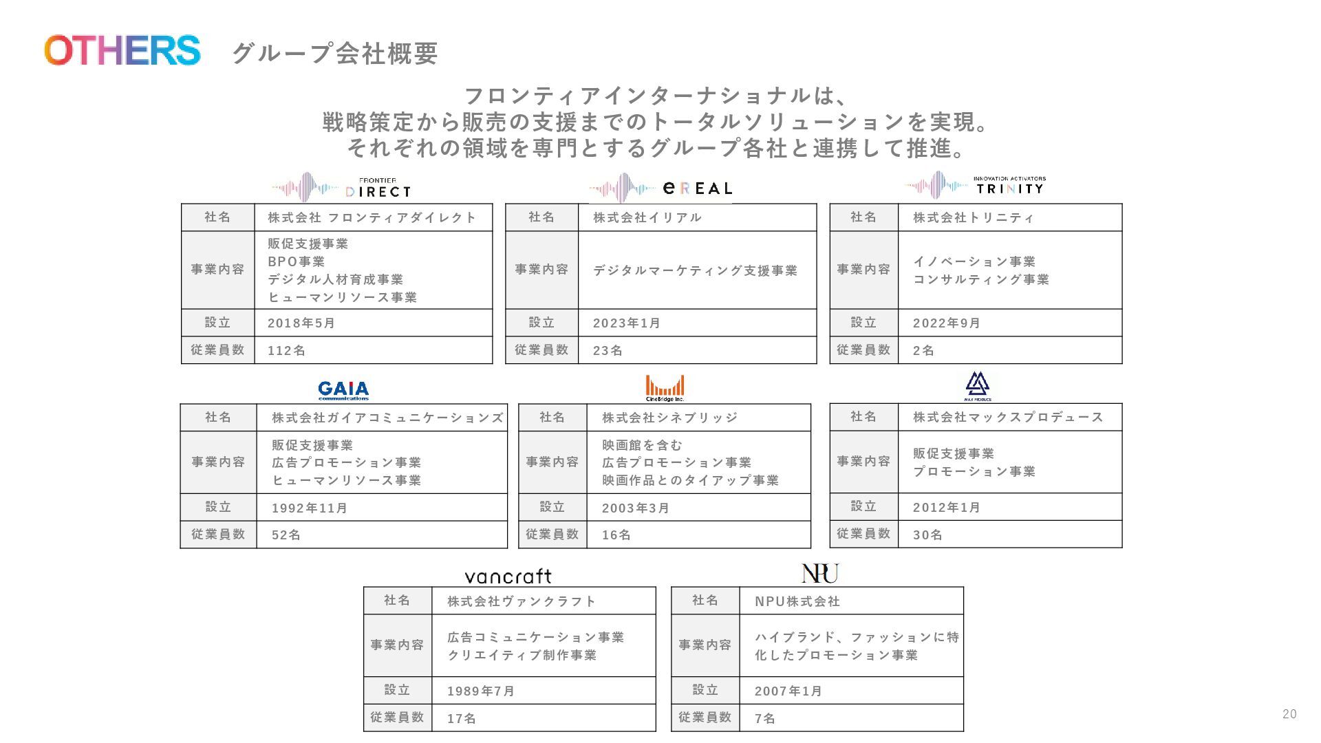 グループ会社 株式会社フロンティアインターナショナル エクスペリエンスソリューション事業 ヒューマンソリューション事業 デジタル・テクノロジーソリューション事業 河村 康宏 1990年6月 429,766千円(資本準備金含む) 東京都渋谷区渋谷3-3-5 NBF 渋谷イースト 札幌、仙台、東京、名古屋 大阪、広島、小倉、福岡 464人(2025年4月末現在) 約42,000名 株式会社フロンティアダイレクト 株式会社イリアル 株式会社トリニティ 株式会社ガイアコミュニケーションズ 株式会社シネブリッジ 株式会社マックスプロデュース 株式会社ヴァンクラフト NPU 株式会社 1990 2001 2005 2008 2009 2010 2013 6月 イベントキャンペーンの企画、制作、 運営を目的として東京都港区六本木 に当社設立 7月 現在地(東京都渋谷区渋谷)に、 本社移転 11月 名古屋オフィスを新設 2月 大阪オフィスを新設 5月 福岡オフィスを新設 8月 中国に划劳通文化艺术咨询(上海) 有限公司を設立 4月 店頭販売支援事業に特化した セルコム株式会社を設立 5月 インドネシアにPT.FRONTIER INTERNATIONAL INDONESIAを設立 2018 2月 札幌オフィスを新設 5月 株式会社フロンティアインターナショナル の店頭販売支援事業を2018年5月1日付け で分社化し新会社「株式会社フロンティア ダイレクト」を設立 2019 2月 東証マザーズ 上場 2021 6月 仙台、千葉、金沢、広島、小倉、熊本、静岡に サテライトオフィスを出店 9月 株式会社ワールドパークへ出資 11月 体験創造研究所を設立 2022 2月 ANOBAKA3号有限責任事業組合へ出資 4月 名古屋オフィスを愛知県名古屋市中村区に移転 4月 東京証券取引所の市場区分の見直しにより、東京 証券取引所マザーズからグロース市場に移行 9月 株式会社トリニティ設立 2023 5月 株式会社イリアル設立 12月 株式会社シックスティーパーセントへ出資 2024 1月 株式会社ガイアコミュニケーションズ 子会社化 2月 YADOKARI株式会社へ出資 8月 株式会社GROWTH VERSEへ出資 9月 株式会社シネブリッジ 子会社化 フォッグ株式会社へ出資 株式会社マックスプロデュース 子会社化 4月 株式会社ヴァンクラフト 子会社化 株式会社KT Partnersへ出資 9月 NPU株式会社 子会社化 2025 2