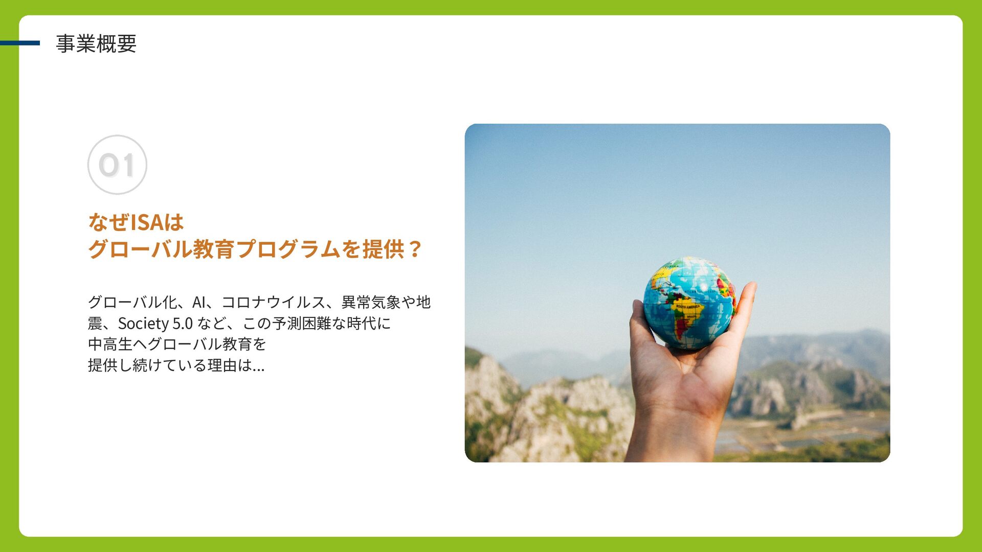 事業概要 なぜISAは グローバル教育プログラムを提供? グローバル化、AI、コロナウイルス、異常気象や地 震、Society 5.0 など、この予測困難な時代に 中高生ヘグローバル教育を 提供し続けている理由は... 01