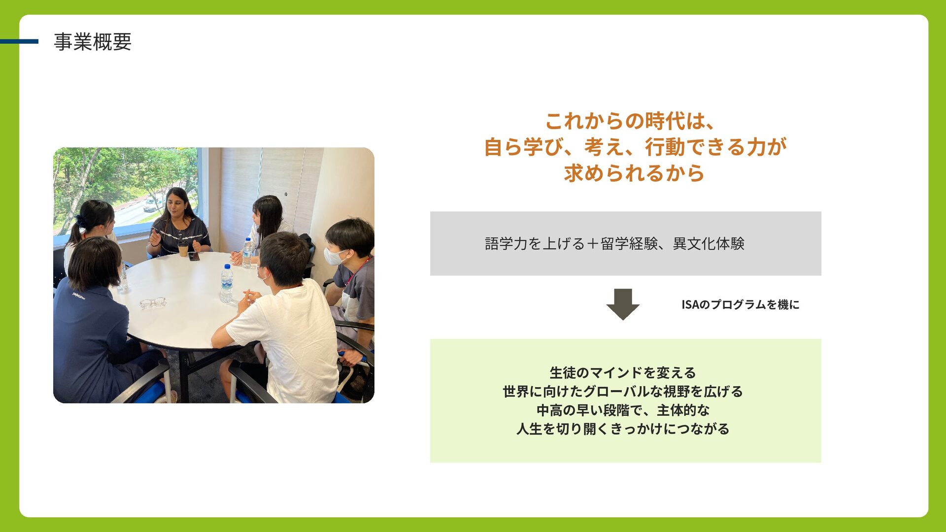 語学力を上げる+留学経験、異文化体験 生徒のマインドを変える 世界に向けたグローバルな視野を広げる 中高の早い段階で、主体的な 人生を切り開くきっかけにつながる ISAのプログラムを機に 事業概要 これからの時代は、 自ら学び、考え、行動できる力が 求められるから