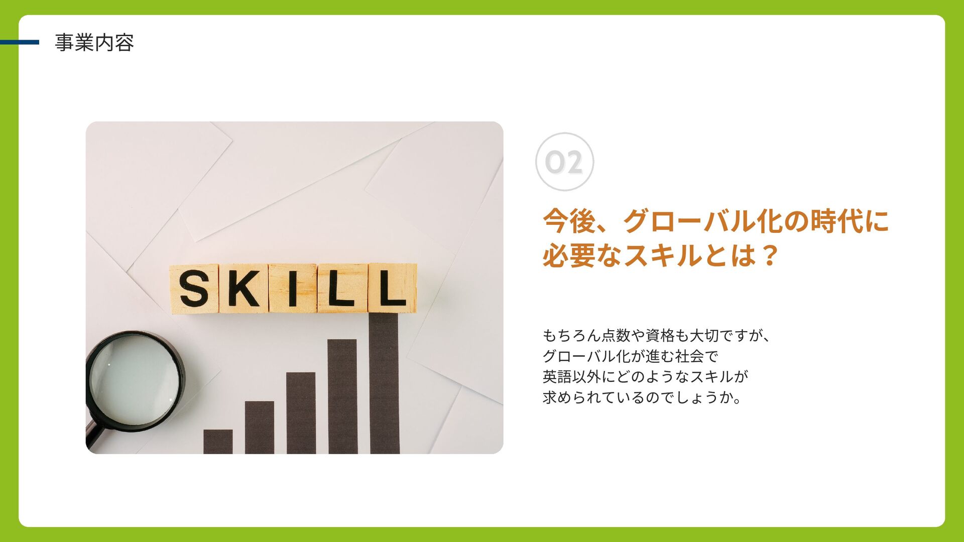 事業内容 今後、グローバル化の時代に 必要なスキルとは? もちろん点数や資格も大切ですが、 グローバル化が進む社会で 英語以外にどのようなスキルが 求められているのでしょうか。 02 02