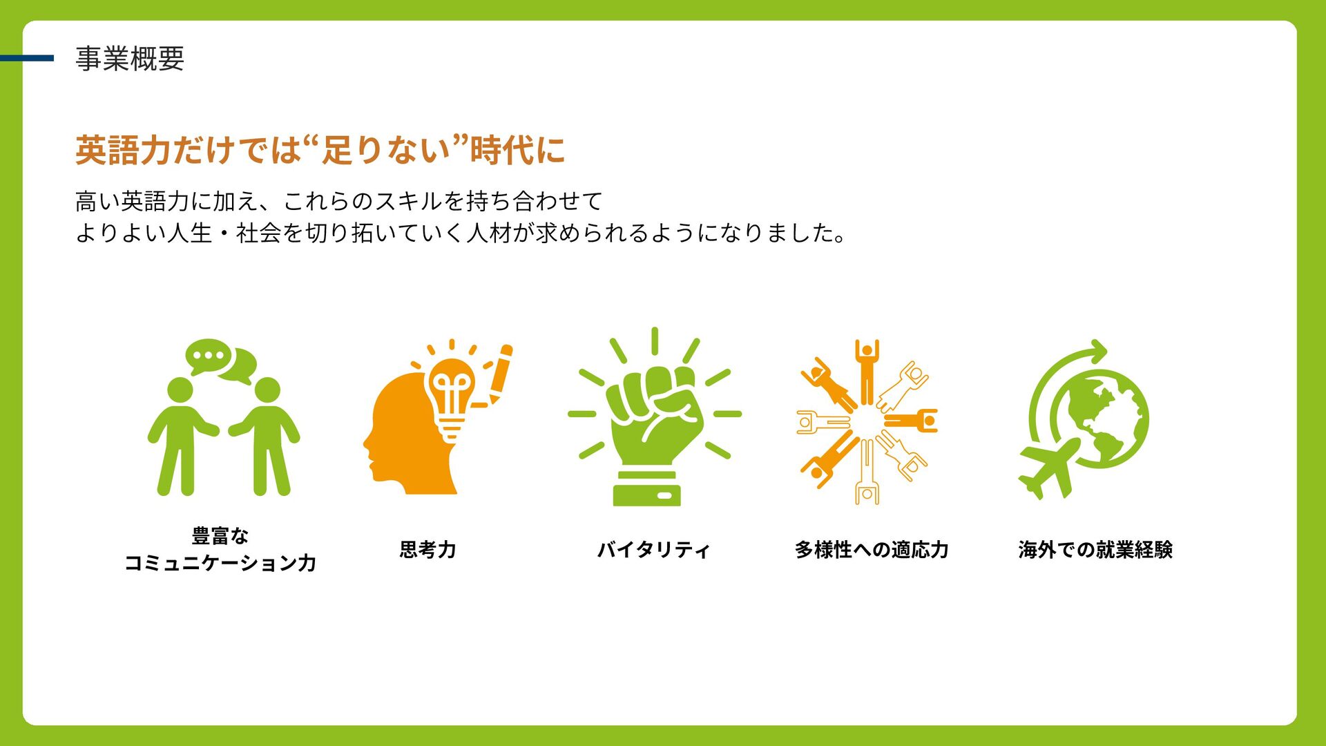 事業概要 英語力だけでは“足りない”時代に 豊富な コミュニケーション力 思考力 バイタリティ 多様性への適応力 海外での就業経験 高い英語力に加え、これらのスキルを持ち合わせて よりよい人生・社会を切り拓いていく人材が求められるようになりました。