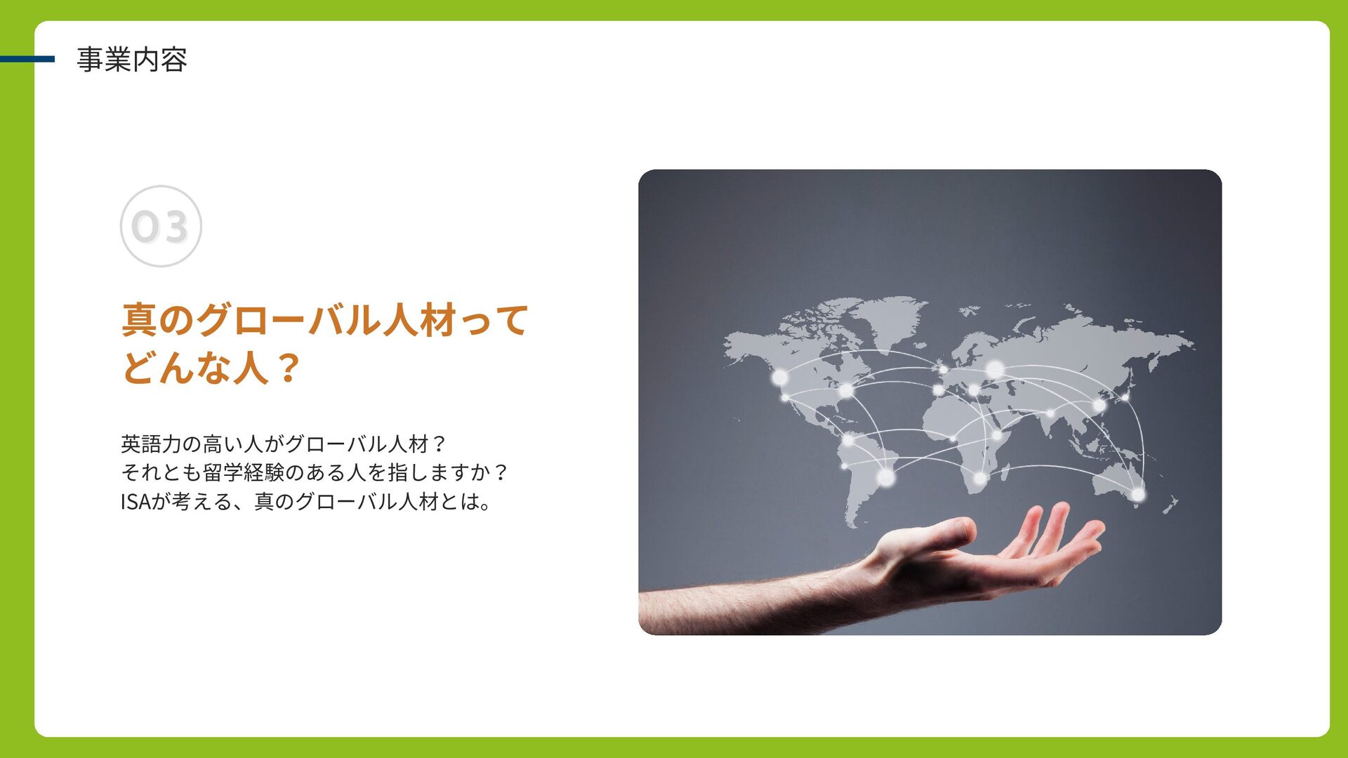 事業内容 真のグローバル人材って どんな人? 英語力の高い人がグローバル人材? それとも留学経験のある人を指しますか? ISAが考える、真のグローバル人材とは。 03 03