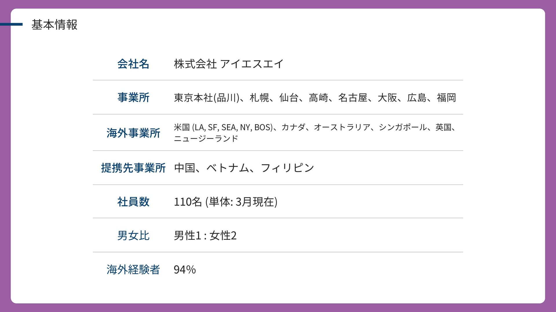 SEA, NY, BOS)、カナダ、オーストラリア、シンガポール、英国、 ニュージーランド 提携先事業所 中国、ベトナム、フィリピン 社員数 110名 (単体: 3月現在) 男女比 男性1 : 女性2 海外経験者 94%