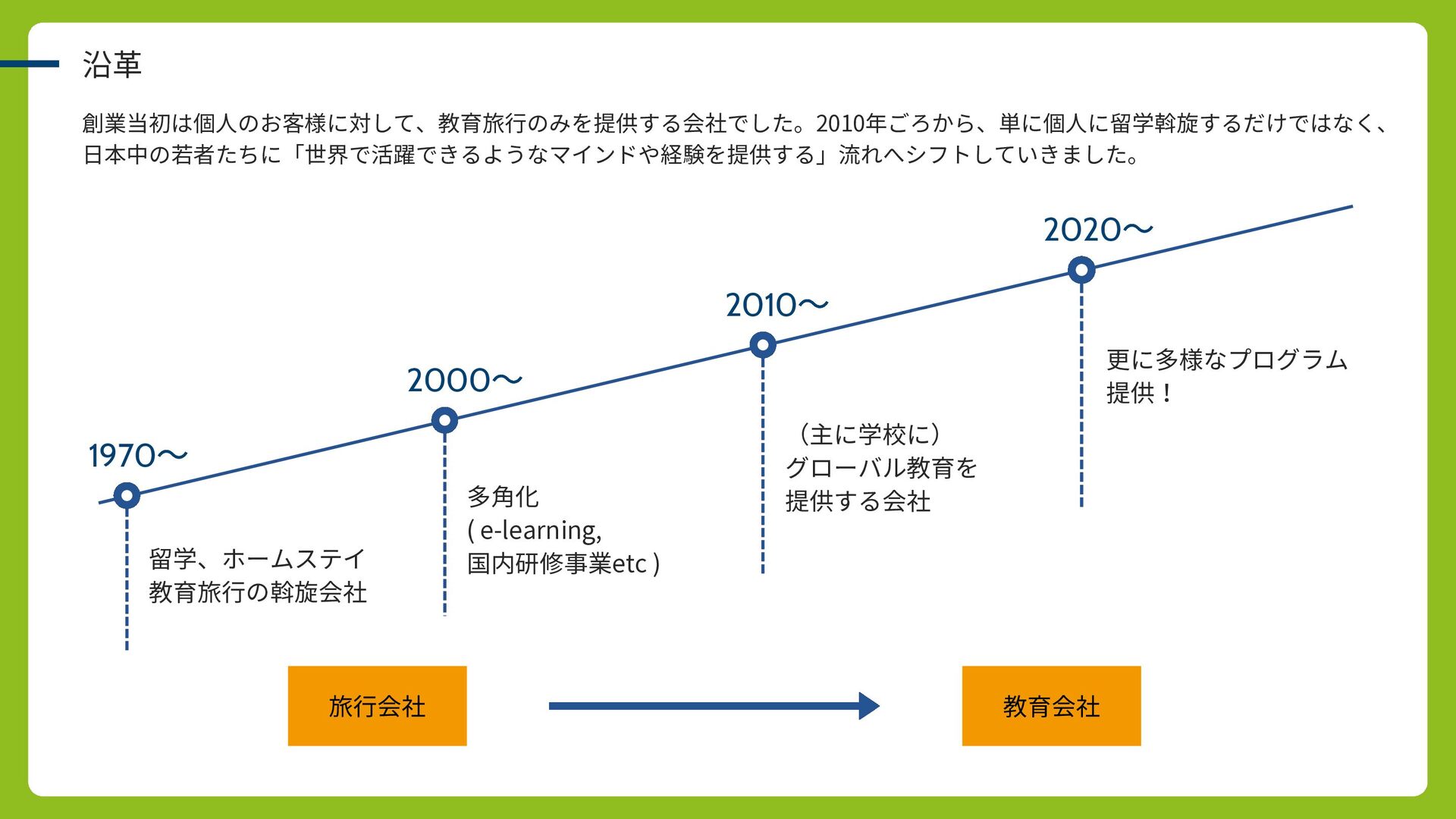 教育会社 沿革 創業当初は個人のお客様に対して、教育旅行のみを提供する会社でした。2010年ごろから、単に個人に留学斡旋するだけではなく、 日本中の若者たちに「世界で活躍できるようなマインドや経験を提供する」流れへシフトしていきました。 1970 〜 留学、ホームステイ 教育旅行の斡旋会社 2000 〜 多角化 ( e-learning, 国内研修事業etc )