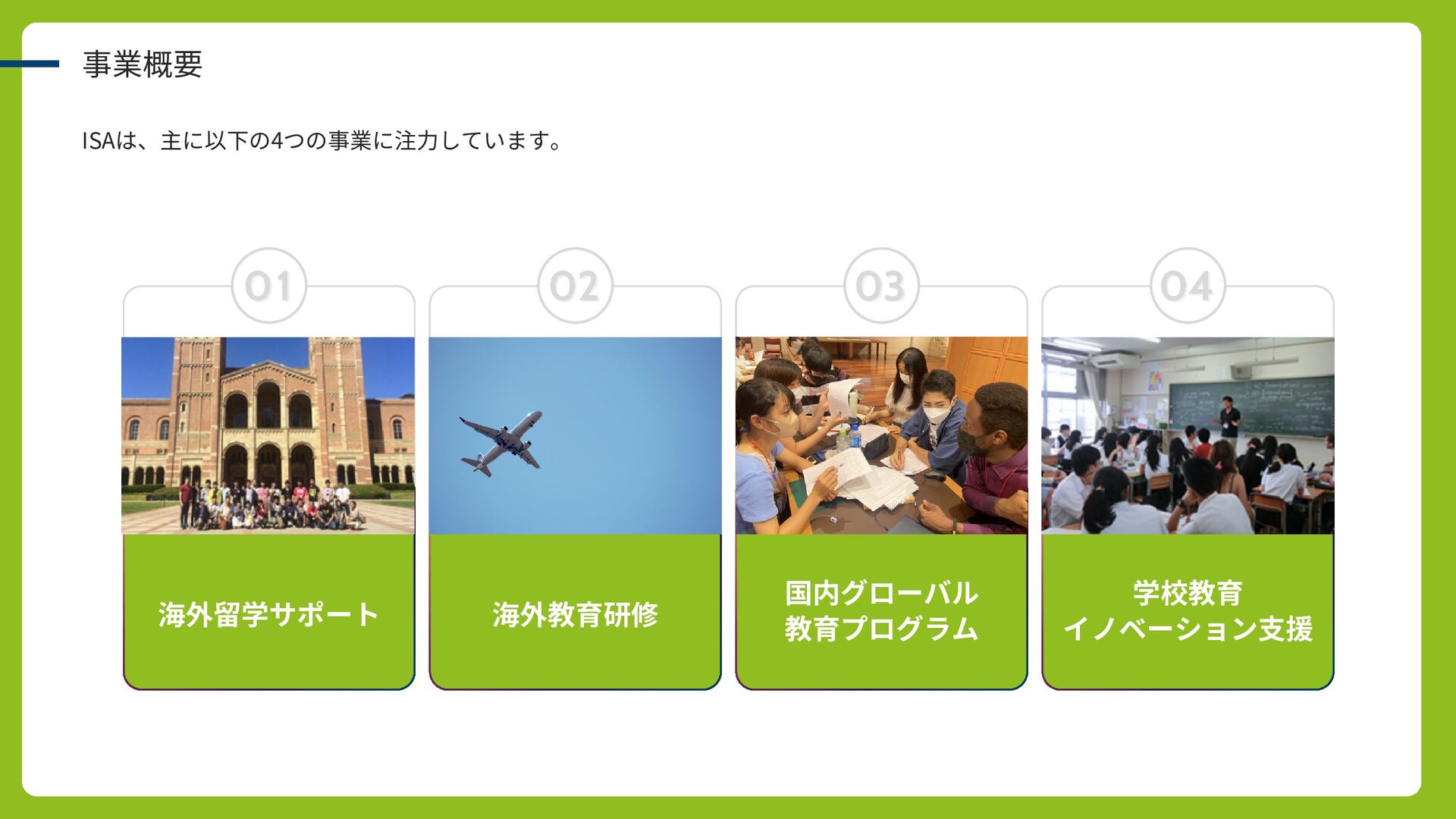 01 01 海外留学サポート 02 02 海外教育研修 事業概要 ISAは、主に以下の4つの事業に注力しています。 03 03