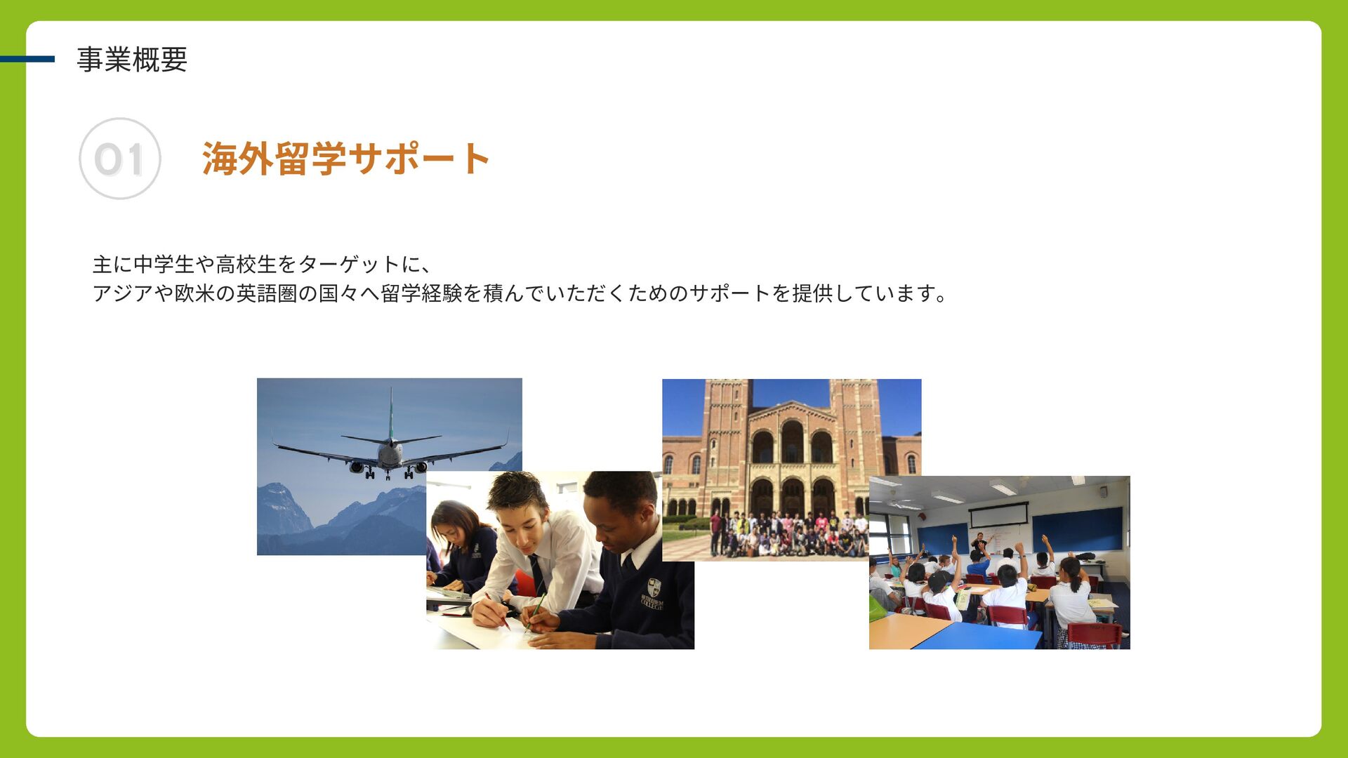 01 01 事業概要 海外留学サポート 主に中学生や高校生をターゲットに、 アジアや欧米の英語圏の国々へ留学経験を積んでいただくためのサポートを提供しています。