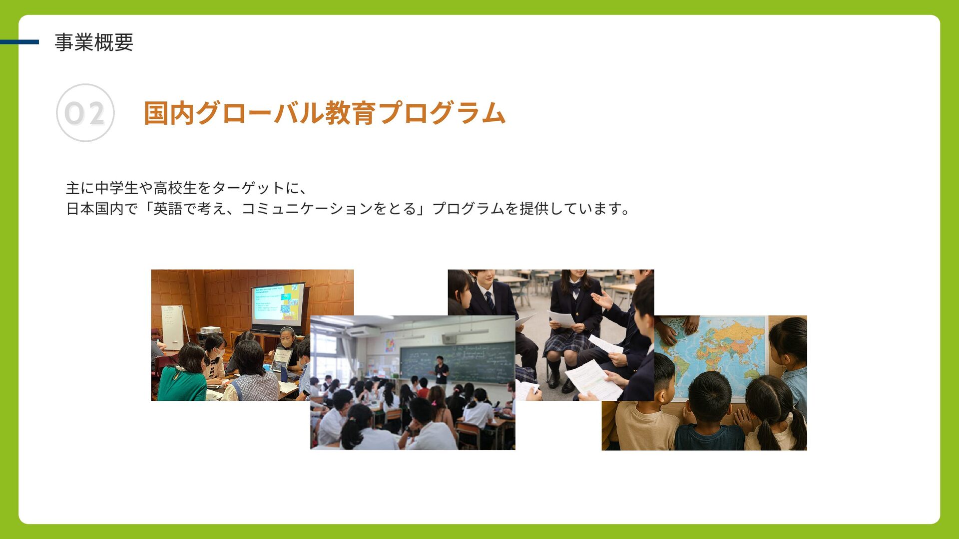 02 02 事業概要 国内グローバル教育プログラム 主に中学生や高校生をターゲットに、 日本国内で「英語で考え、コミュニケーションをとる」プログラムを提供しています。