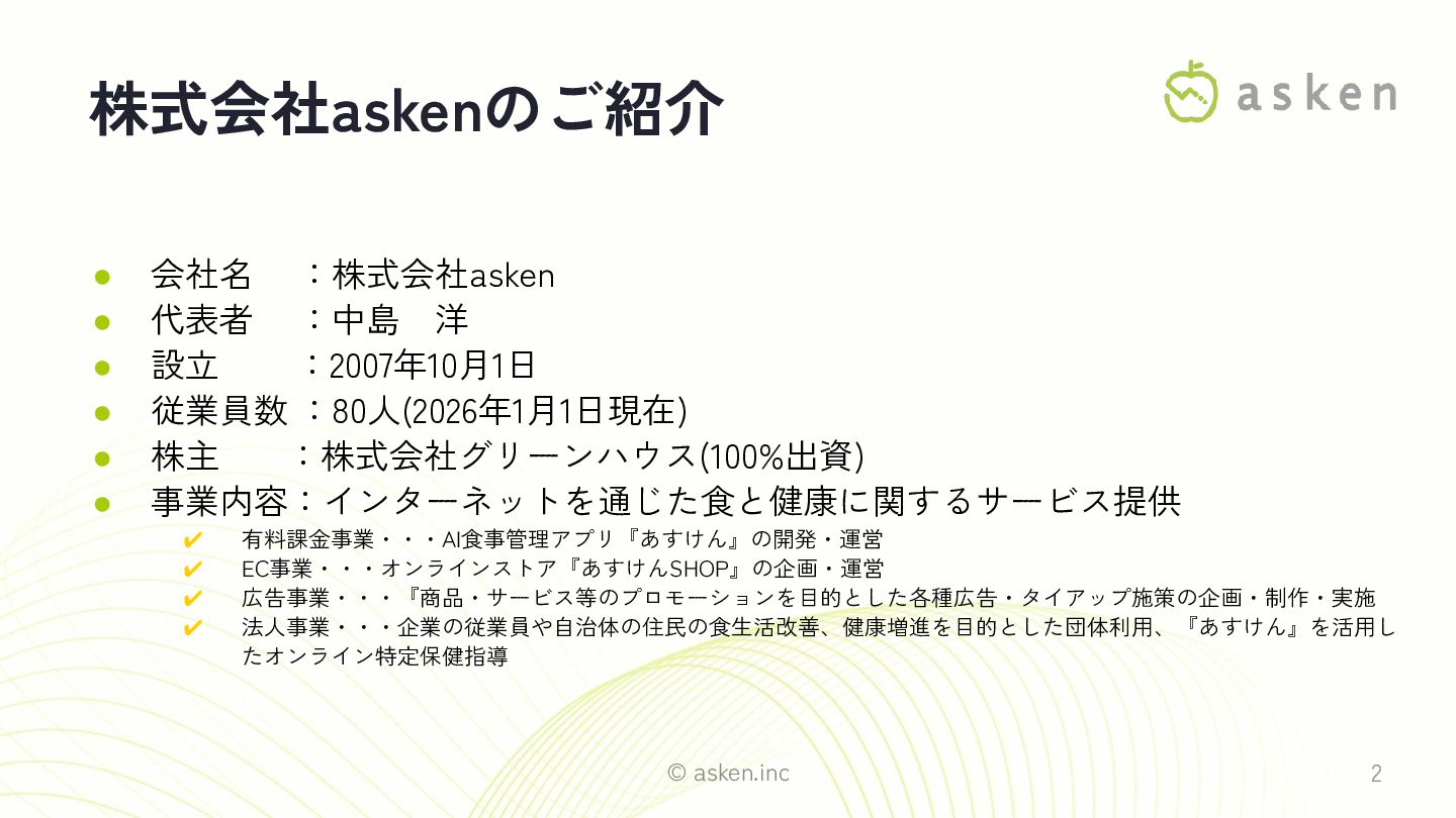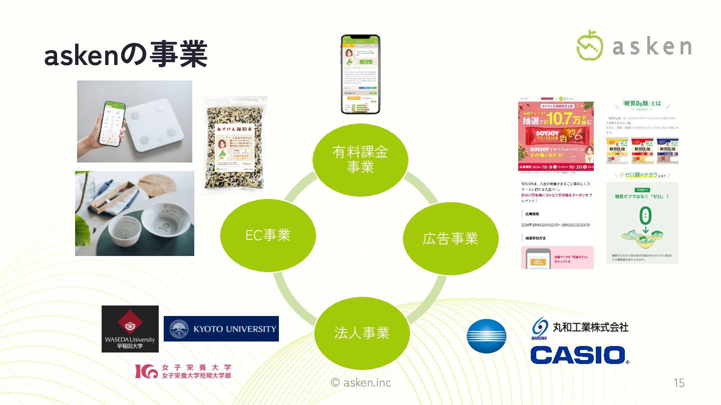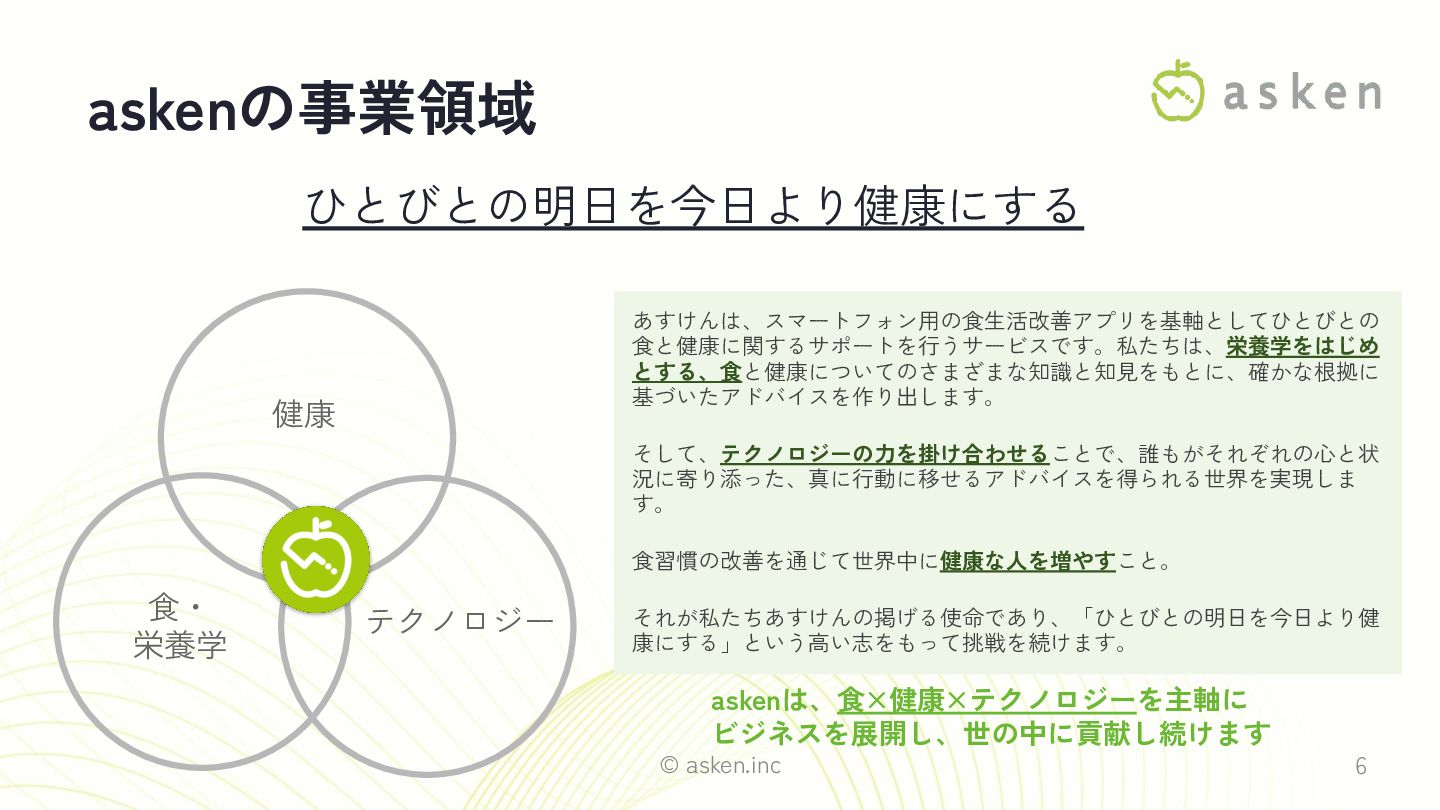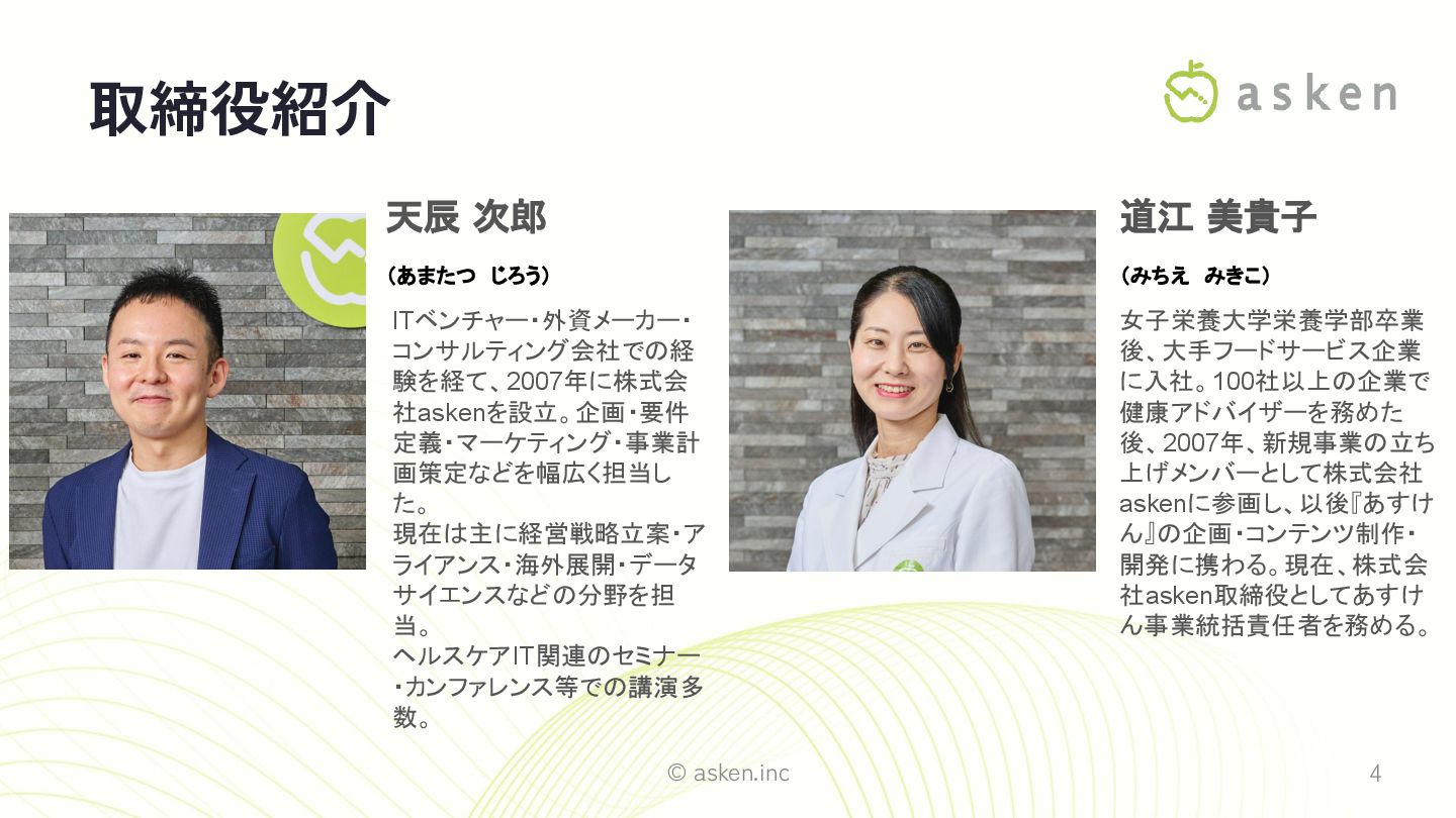 ITベンチャー・外資メーカー・ コンサルティング会社での経 験を経て、2007年に株式会 社askenを設立。企画・要件 定義・マーケティング・事業計 画策定などを幅広く担当し た。 現在は主に経営戦略立案・ア ライアンス・海外展開・データ サイエンスなどの分野を担 当。 ヘルスケアIT関連のセミナー ・カンファレンス等での講演多 数。 女子栄養大学栄養学部卒業 後、大手フードサービス企業 に入社。100社以上の企業で 健康アドバイザーを務めた 後、2007年、新規事業の立ち 上げメンバーとして株式会社 askenに参画し、以後『あすけ ん』の企画・コンテンツ制作・ 開発に携わる。現在、株式会 社asken取締役としてあすけ ん事業統括責任者を務める。