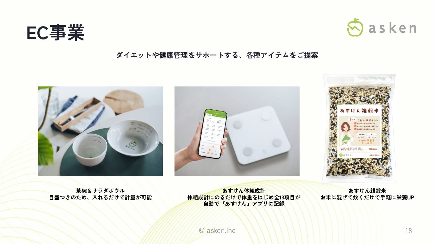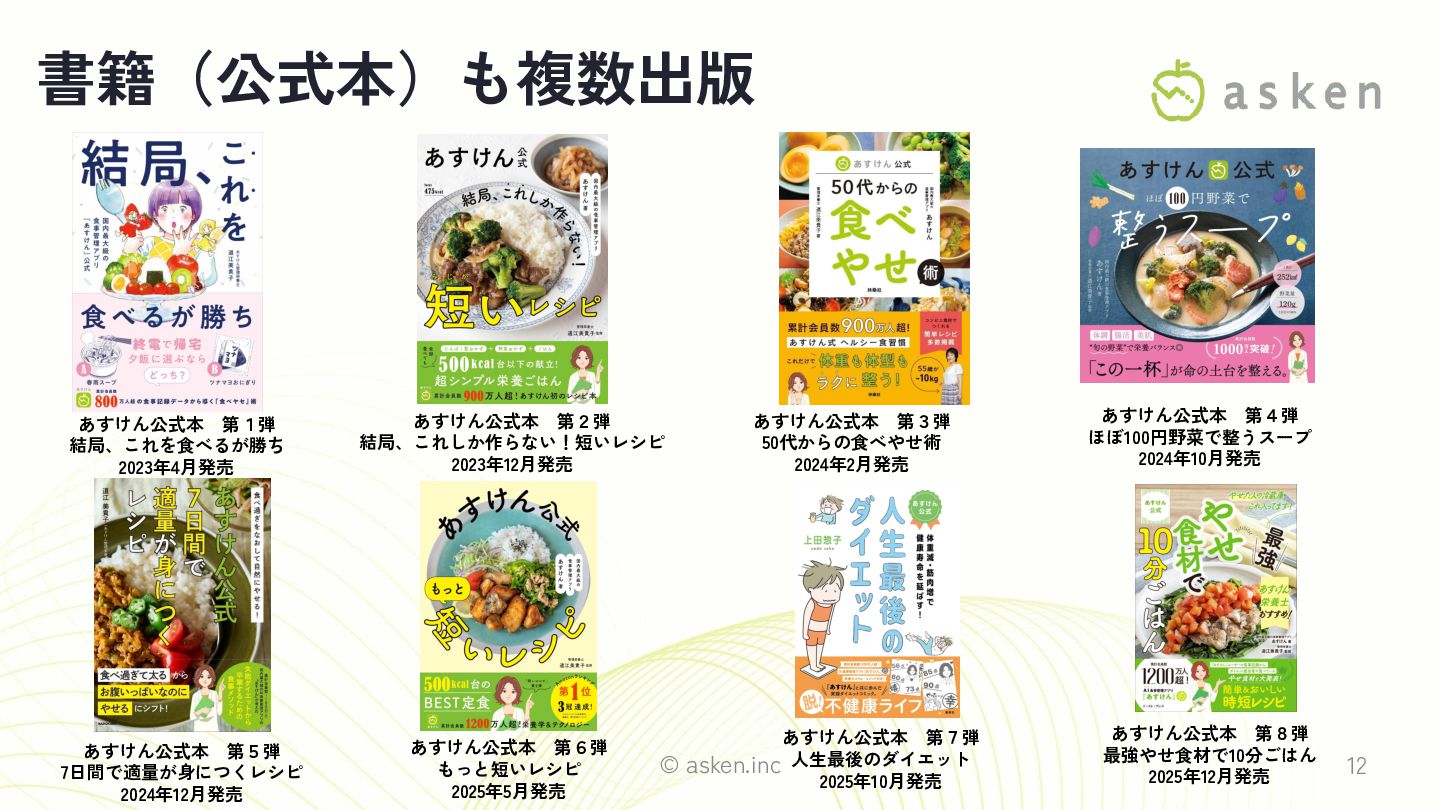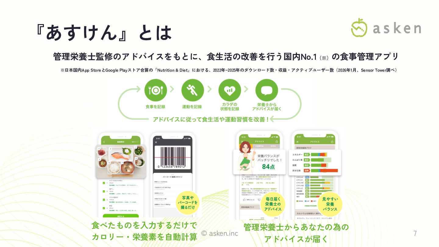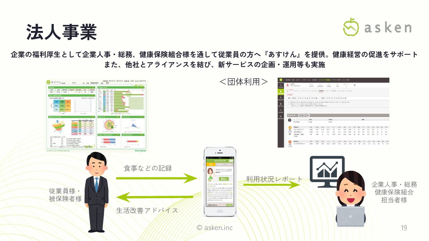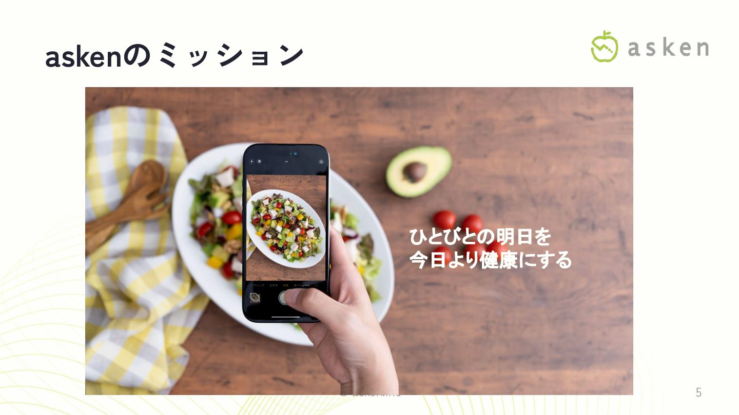 ITベンチャー・外資メーカー・ コンサルティング会社での経 験を経て、2007年に株式会 社askenを設立。企画・要件 定義・マーケティング・事業計 画策定などを幅広く担当し た。 現在は主に経営戦略立案・ア ライアンス・海外展開・データ サイエンスなどの分野を担 当。 ヘルスケアIT関連のセミナー ・カンファレンス等での講演多 数。 女子栄養大学栄養学部卒業 後、大手フードサービス企業 に入社。100社以上の企業で 健康アドバイザーを務めた 後、2007年、新規事業の立ち 上げメンバーとして株式会社 askenに参画し、以後『あすけ ん』の企画・コンテンツ制作・ 開発に携わる。現在、株式会 社asken取締役としてあすけ ん事業統括責任者を務める。